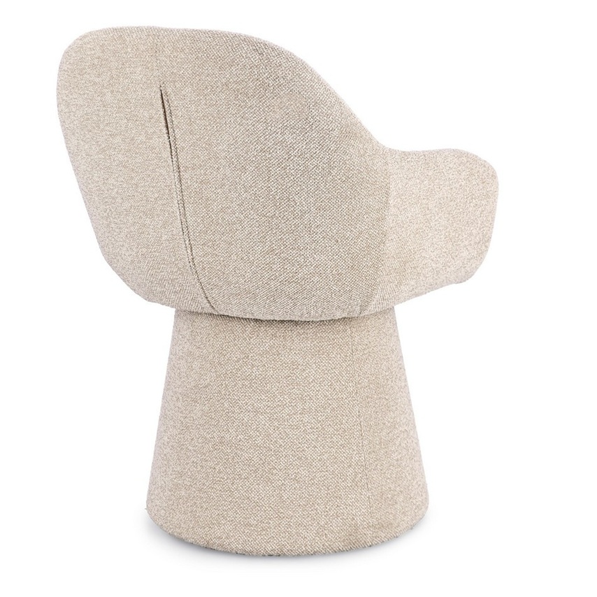 Precioso sillón con reposabrazos y giratorio, de diseño moderno, con estructura de madera y acero y tapizado totalmente en tela color beige.