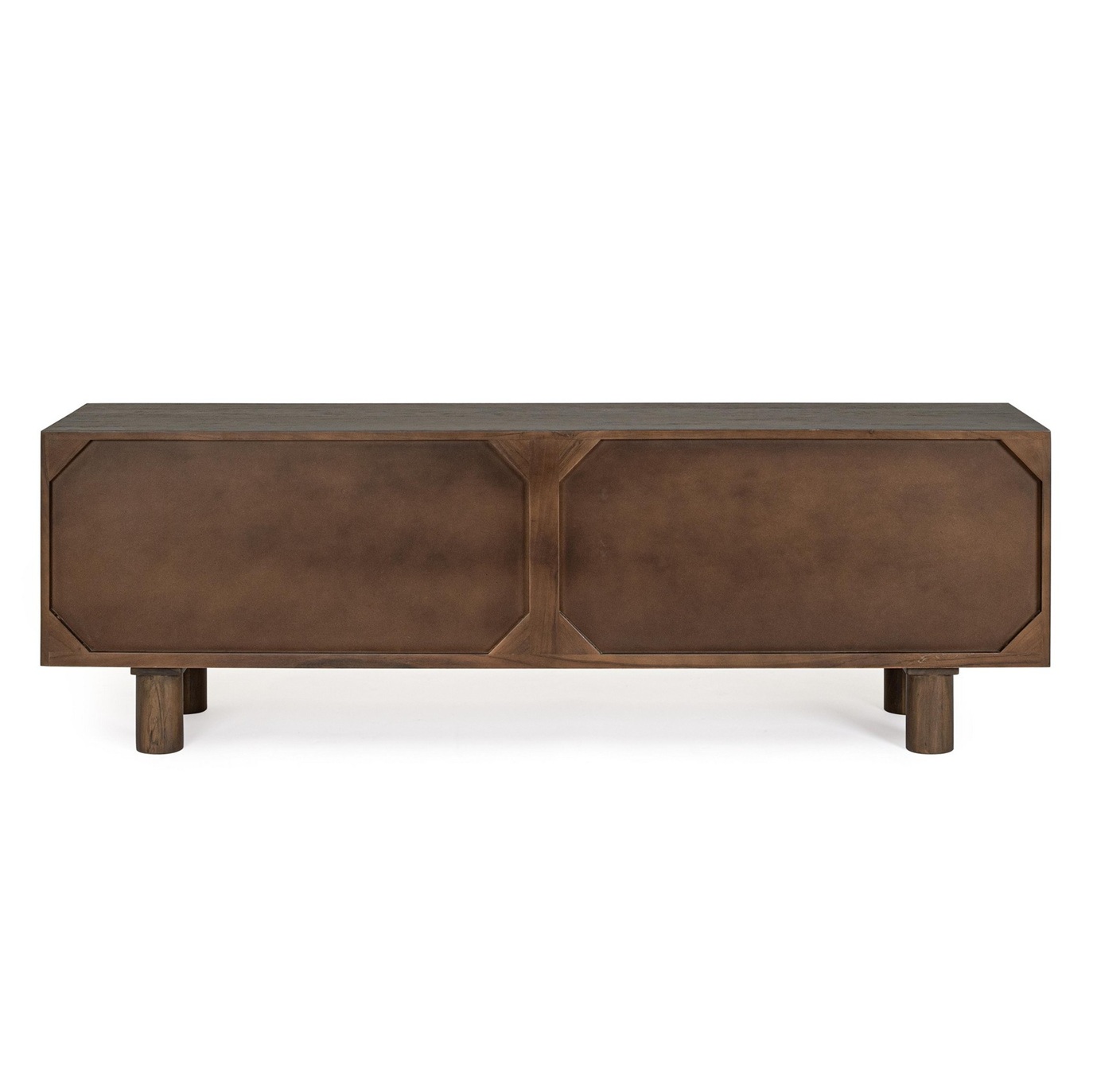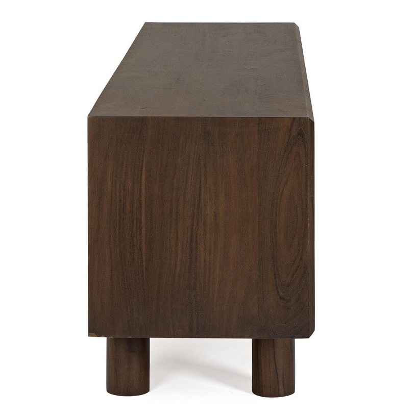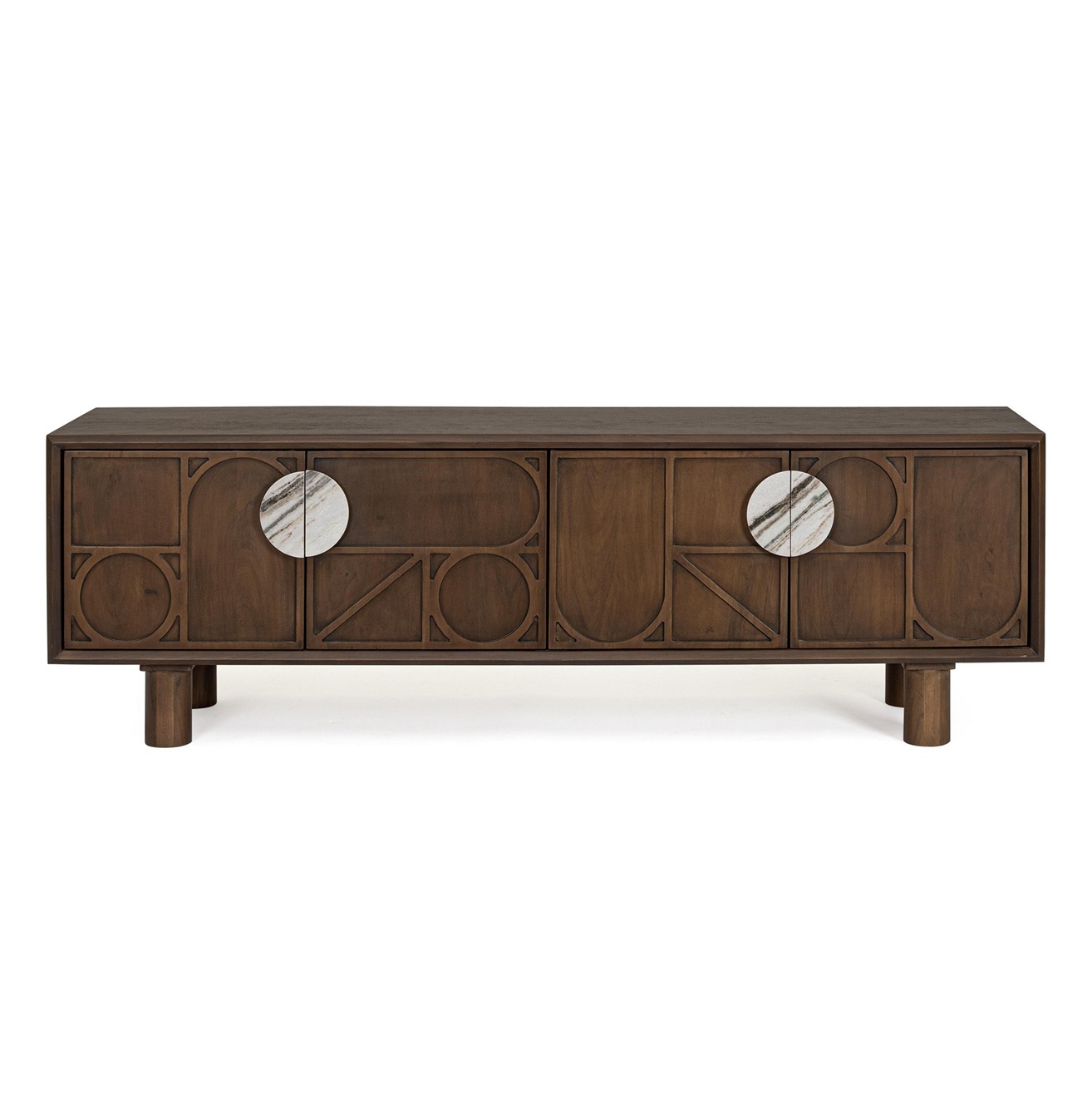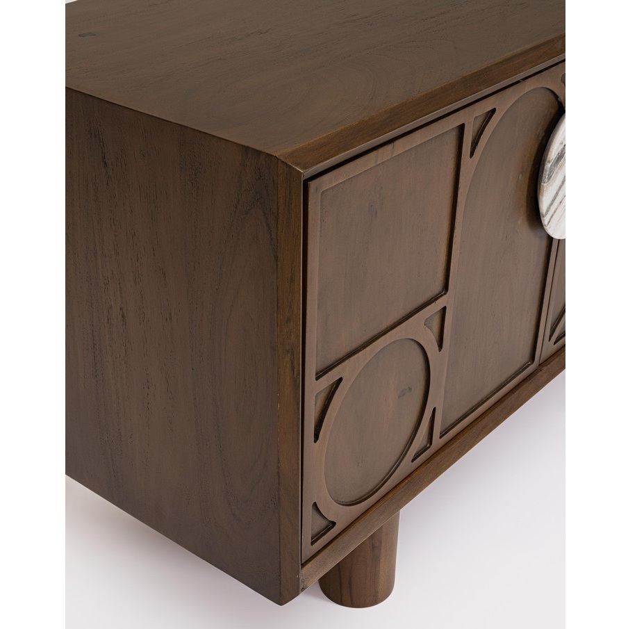 Espectacular mueble de televisión, de diseño moderno e inspiración rústica, fabricado en madera de acacia en color natural y tallas geométricas en el frente. Tiene 4 puertas con preciosos tiradores redondos de mármol.