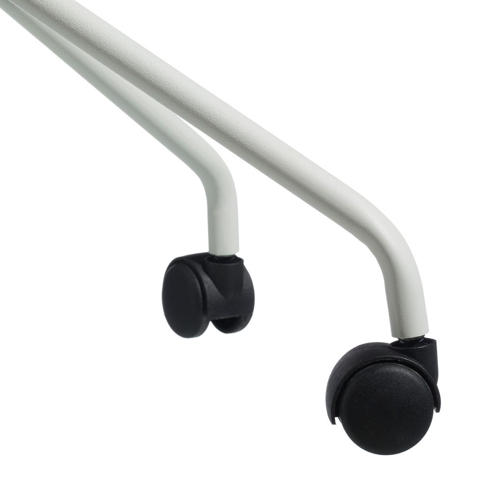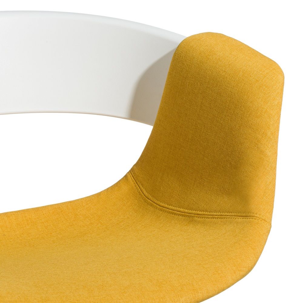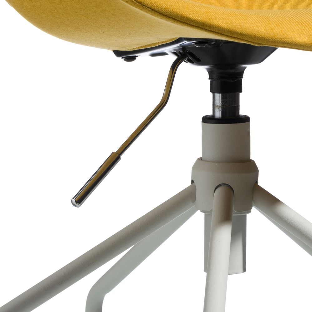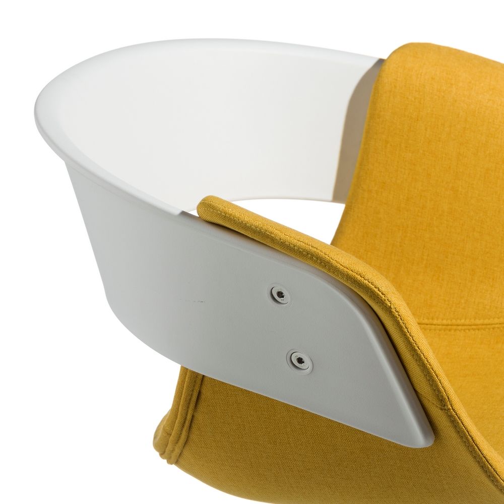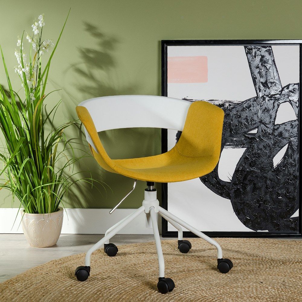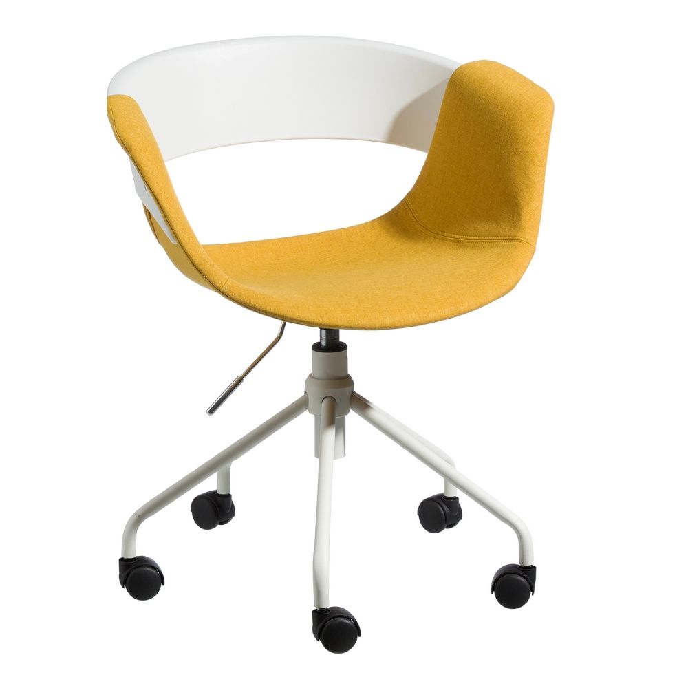 Deliciosa silla con reposabrazos de diseño moderno fabricada en polipropileno con precioso acabado en color blanco y amarillo combinado con patas de metal con ruedas en acabado color blanco.