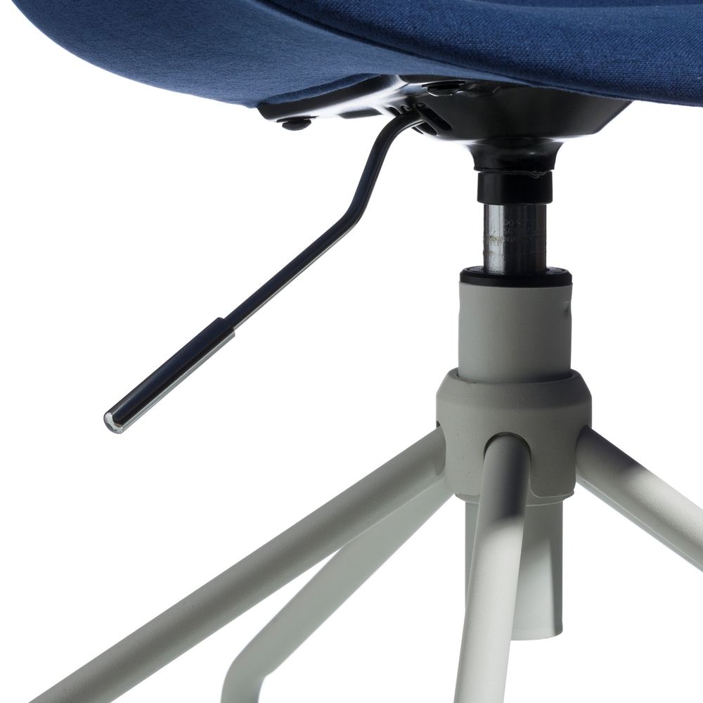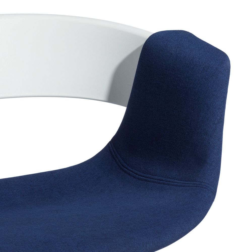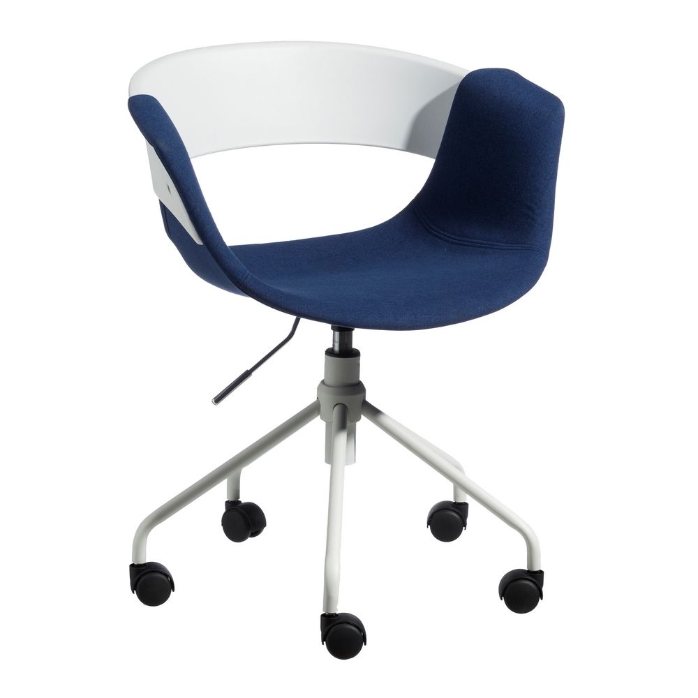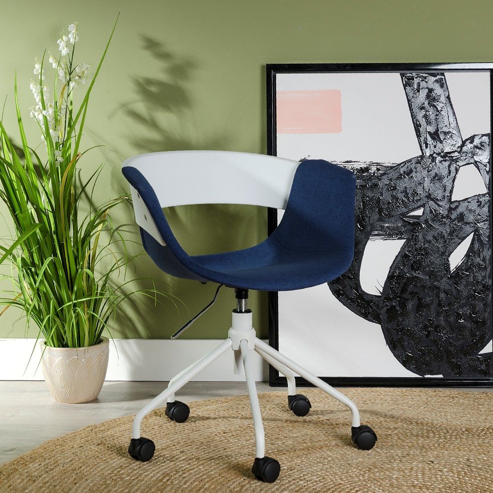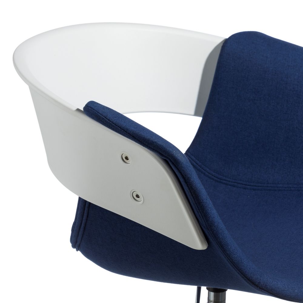 Deliciosa silla con reposabrazos de diseño moderno fabricada en polipropileno con precioso acabado en color blanco y azul combinado con patas de metal con ruedas en acabado color blanco.