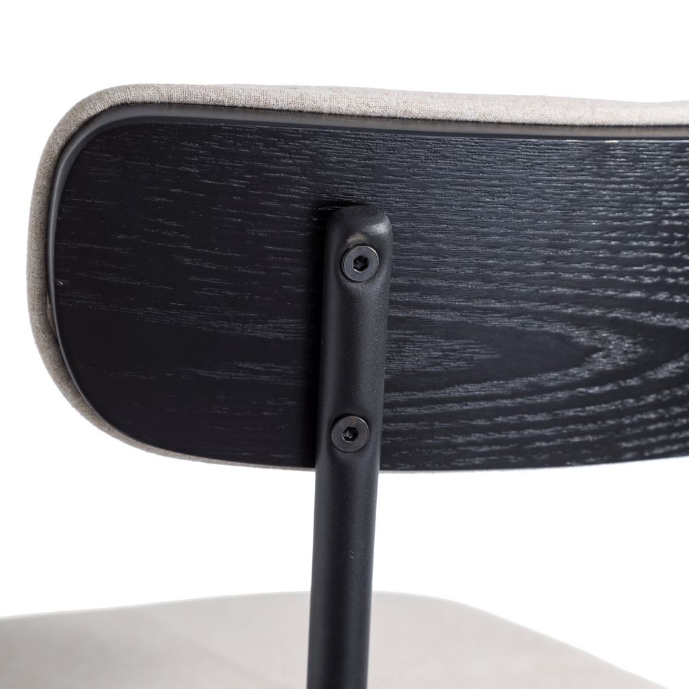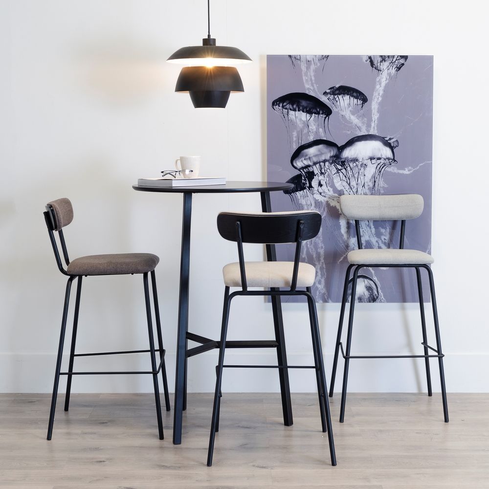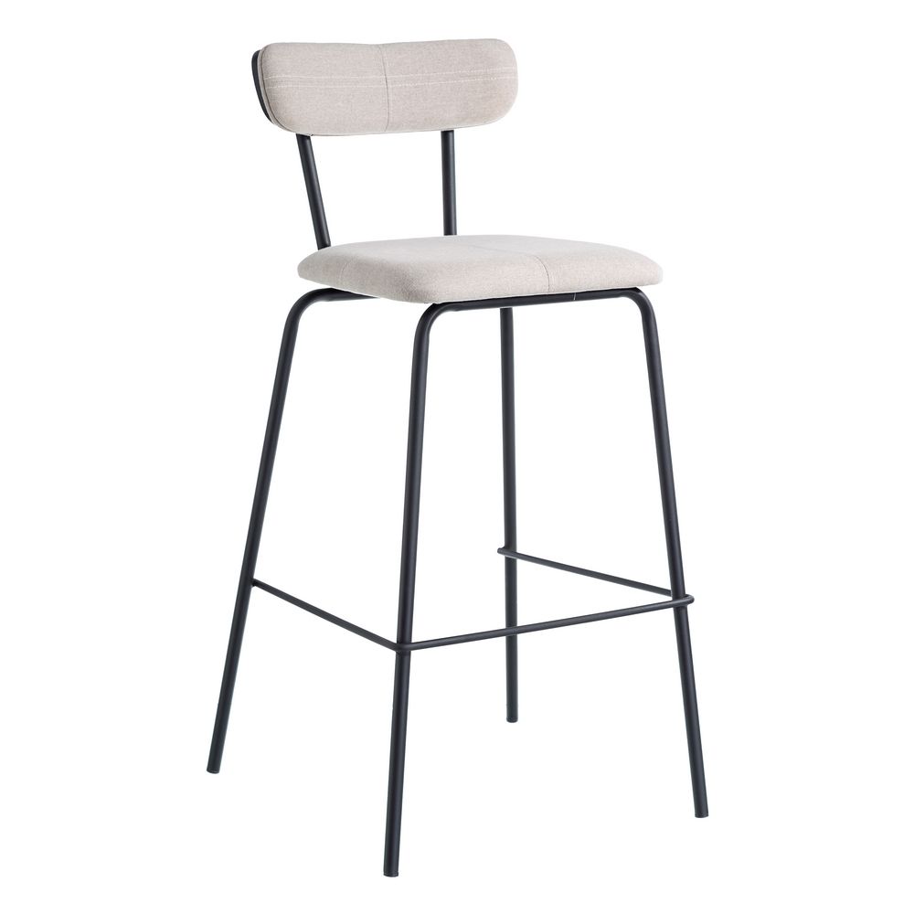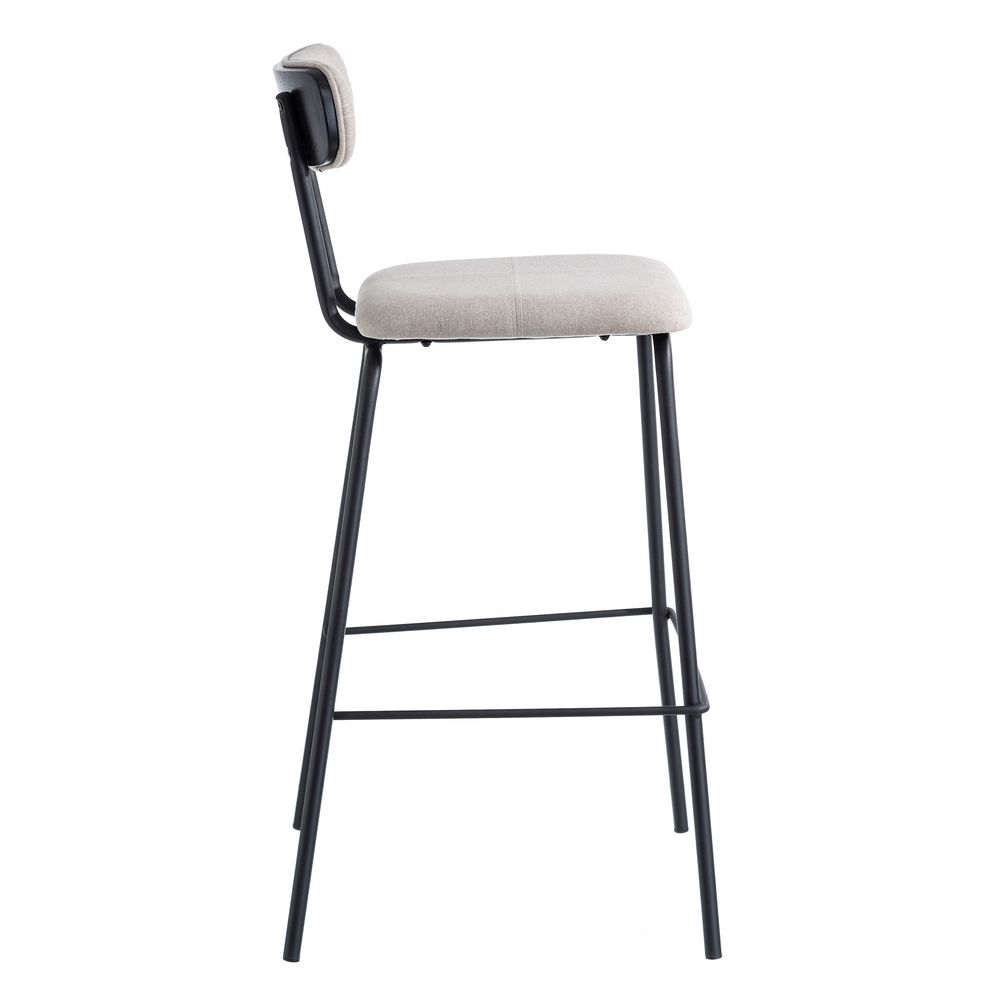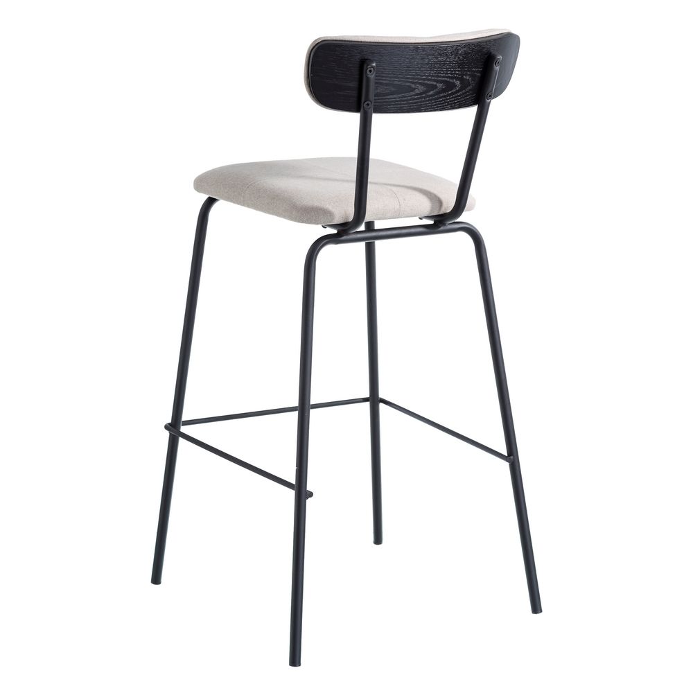 Irresistible taburete alto de diseño vintage e inspiración industrial con estructura de acero acabado negro y chapa de madera, tapizado en bonita tela color beige.