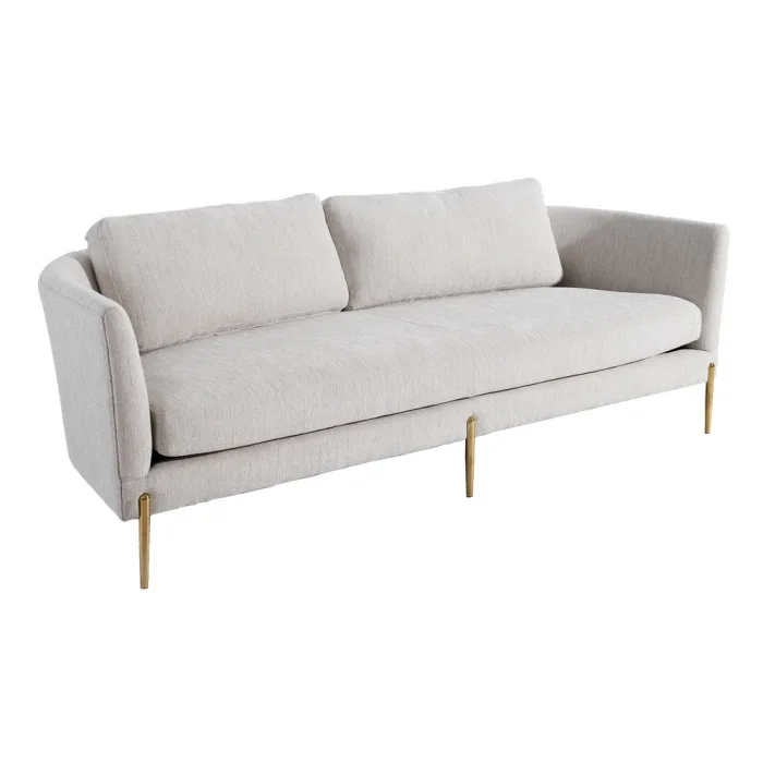 Trabajado y sofisticado sofá de diseño moderno e inspiración Art Decó tapizado en preciosa tela color blanco crudo con elegantes patas altas de metal acabado dorado.