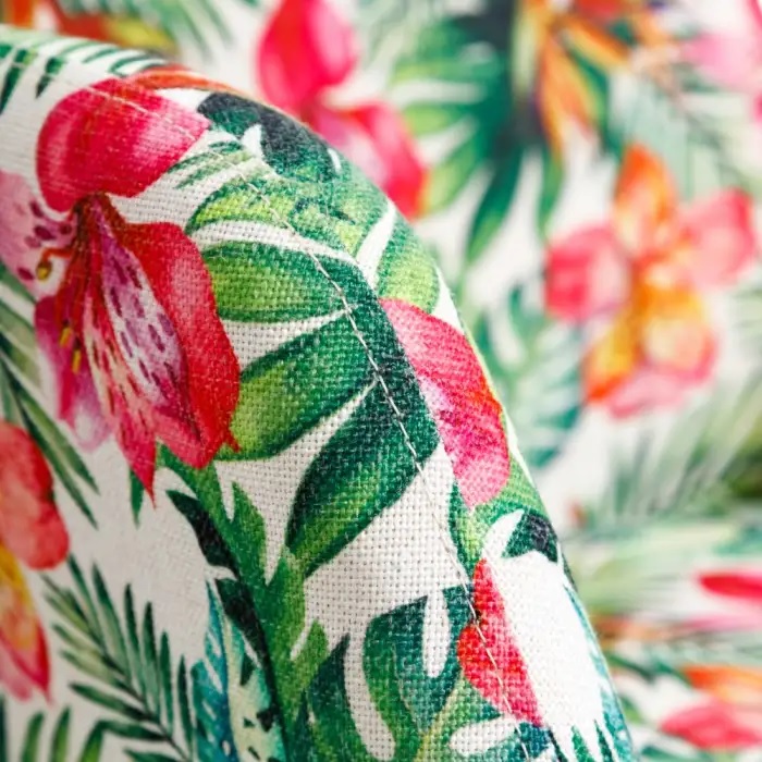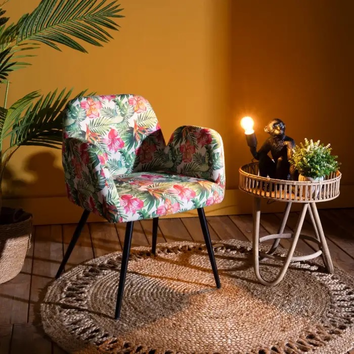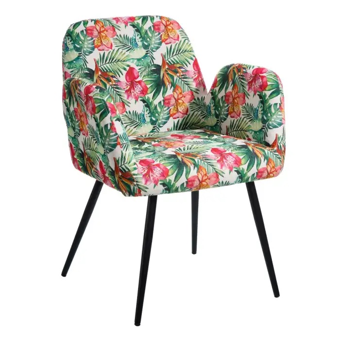 Exclusiva silla con reposabrazos de diseño vintage con elegantes patas inclinadas de hierro en acabado color negro y tapizado en tela con preciosos motivos florales.