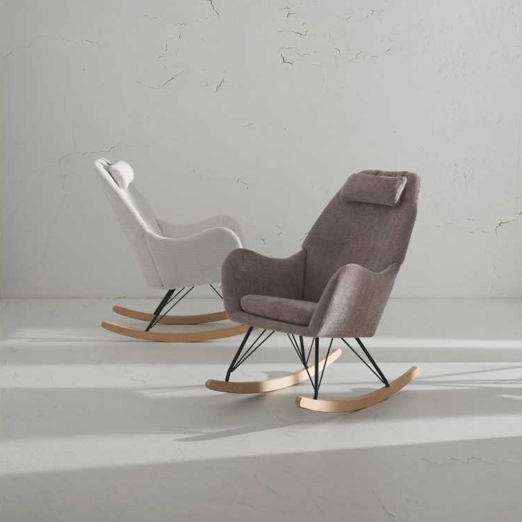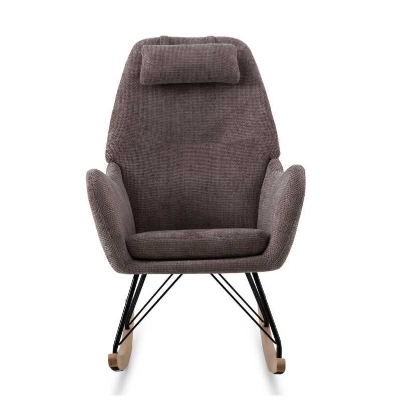 Elegante y confortable sillón mecedora, de diseño moderno e inspiración nórdica, con patas de metal negro combinado con madera de haya y bonito tapizado en chenilla color marrón.