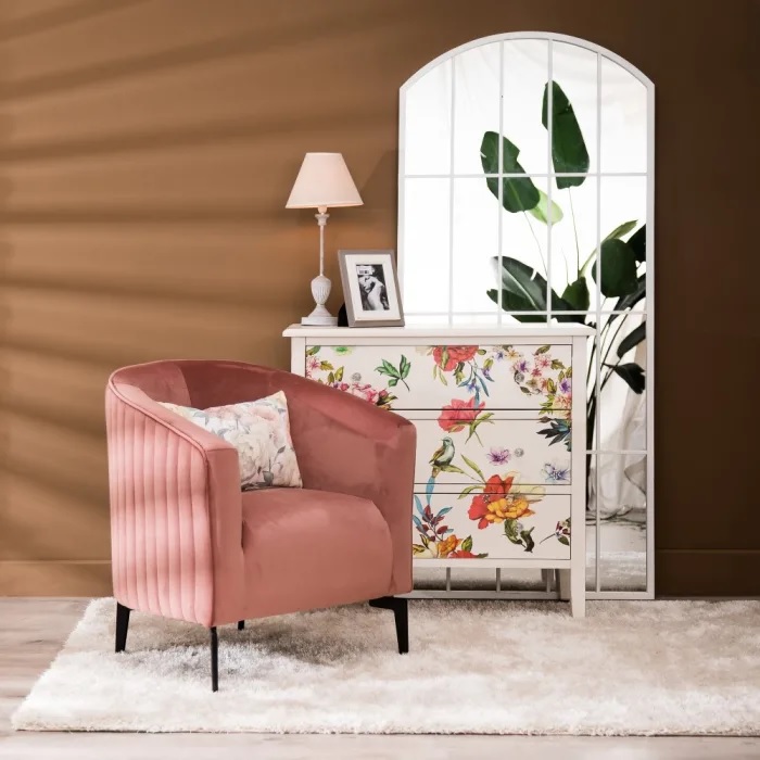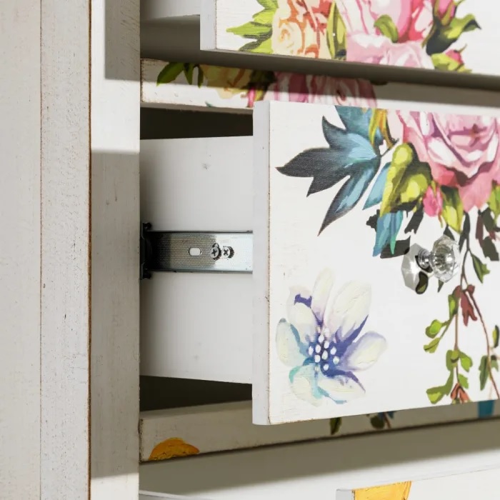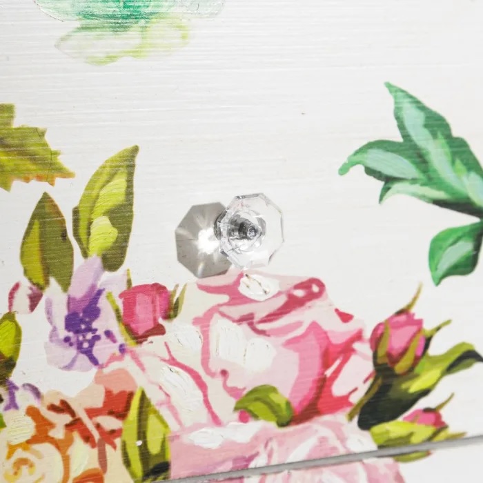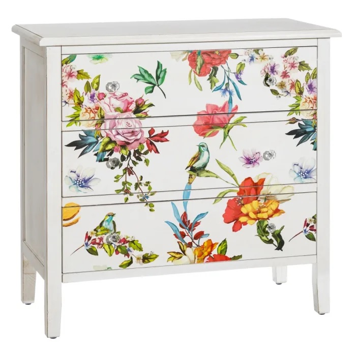 Preciosa cómoda de diseño vintage fabricada en madera de abeto en color blanco con ligeros desgastes. Tiene 3 cajones pintados a mano con coloridos motivos de pájaros y flores y originales tiradores.
