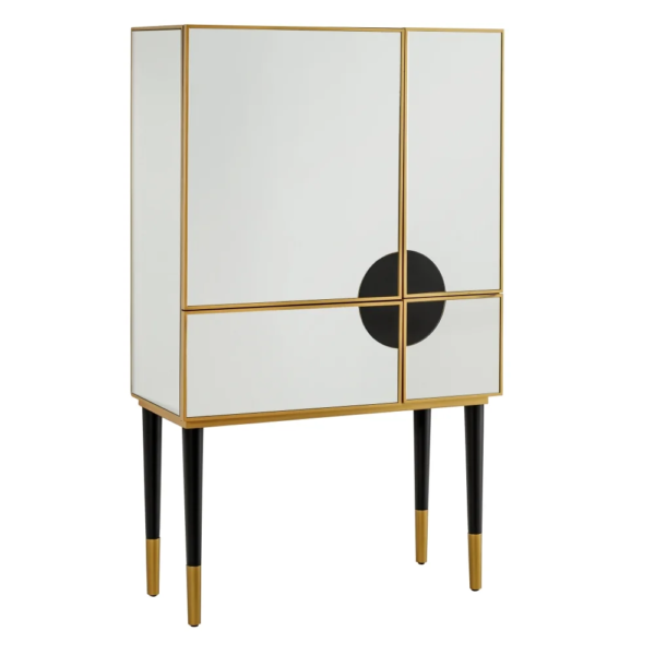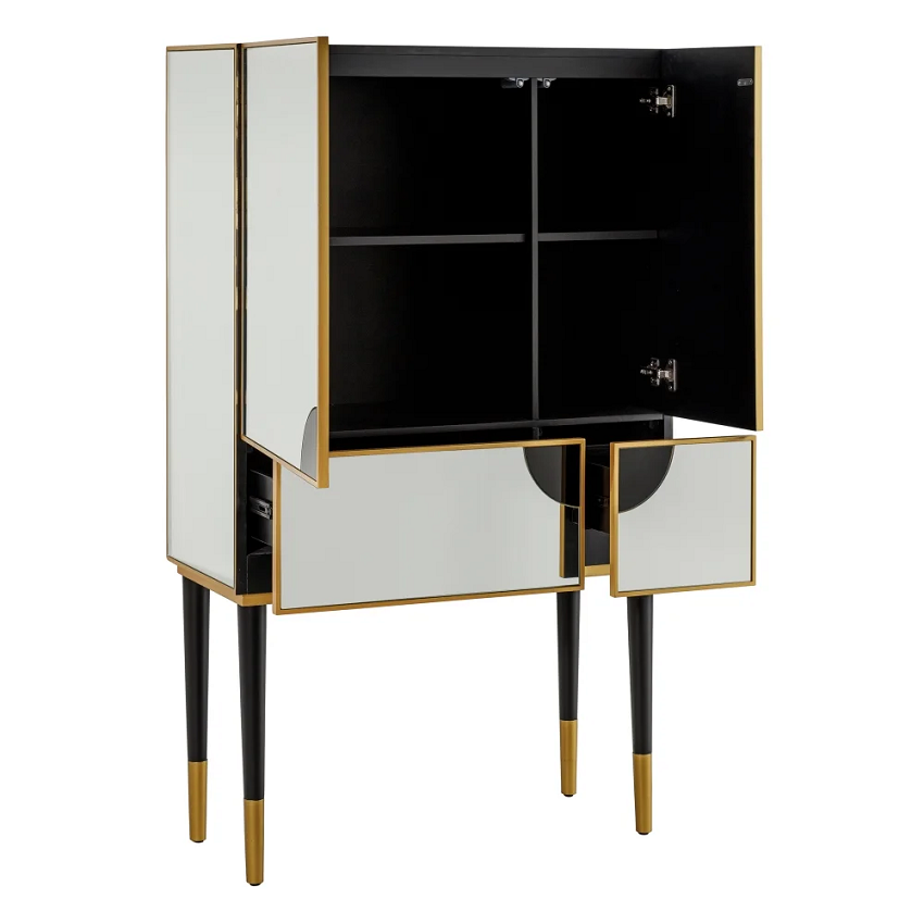 Espectacular armario o mueble bar de diseño Art Decó fabricado en cristal espejo transparente y negro con detalles dorados en el contorno. Elegantes patas altas de madera acabado negro rematadas en hierro color oro.