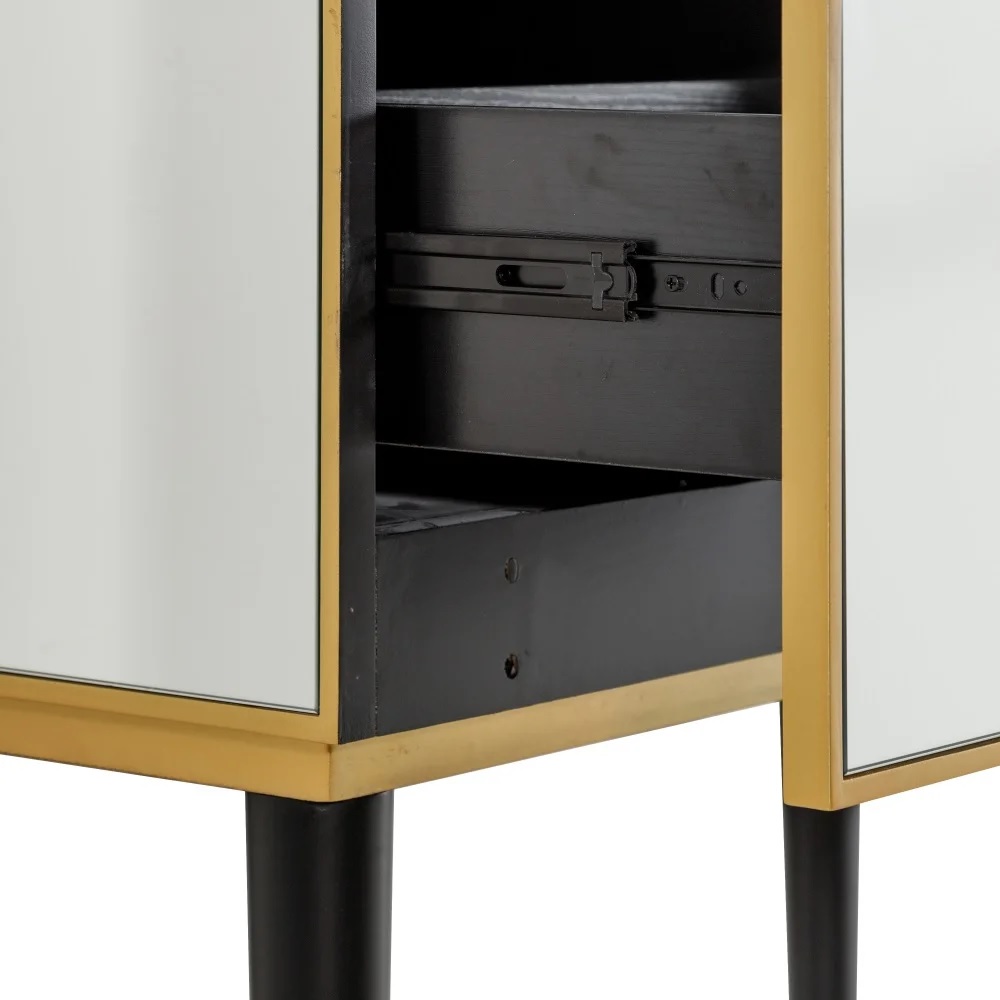 Material: espejo transparente y negro – linea dorada Dm -estructura y patas Dm – extremo de la pata protegida en hierro hierro color oro. Altura patas: 50cm. Medida puertas: 60×97.5 – 29.7×97.5cm. Contiene una leja en su interior. Medida cajones: 60×33.5×27.5 – 30×33.5×27.5cm. Altura pata: 51cm. Requiere montaje.