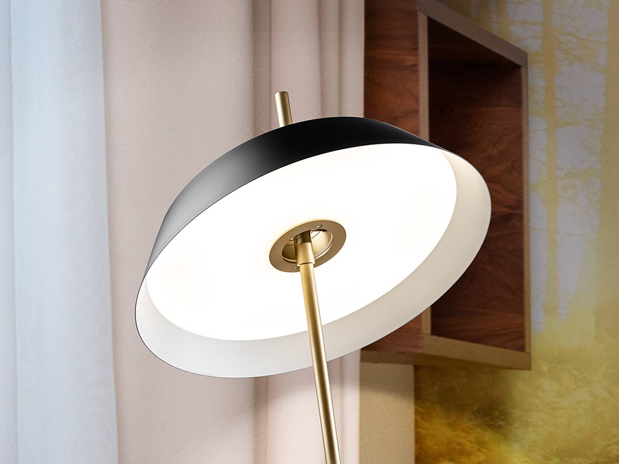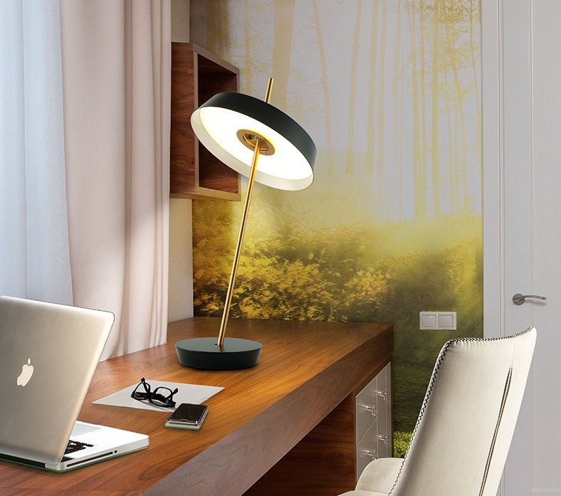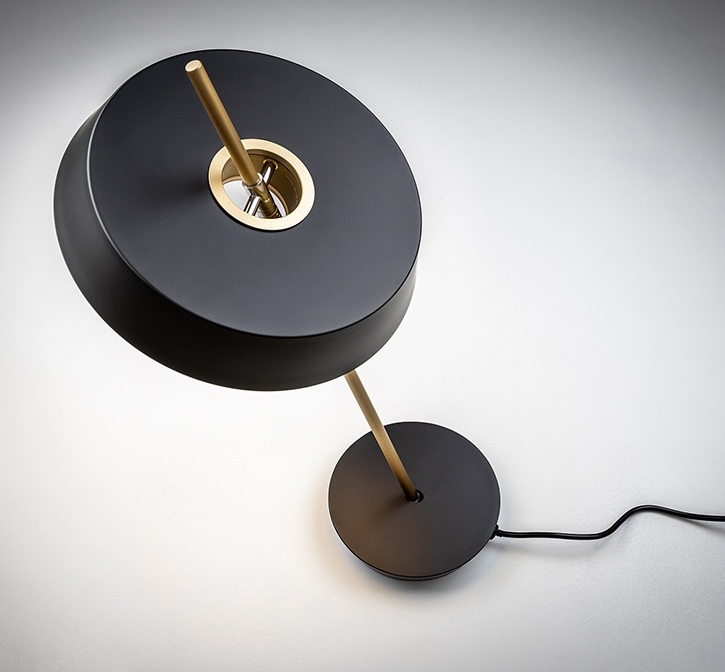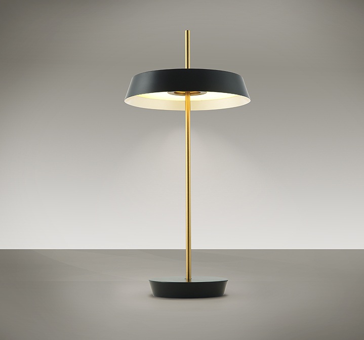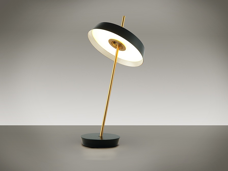 Original y sofisticada lámpara de sobremesa de diseño moderno e inspiración Art Decó fabricada en metal acabado en pintura mate negro y oro. Pantalla con difusor de metacrilato opal. 12W LED, 1.080 lm, 3.000K.