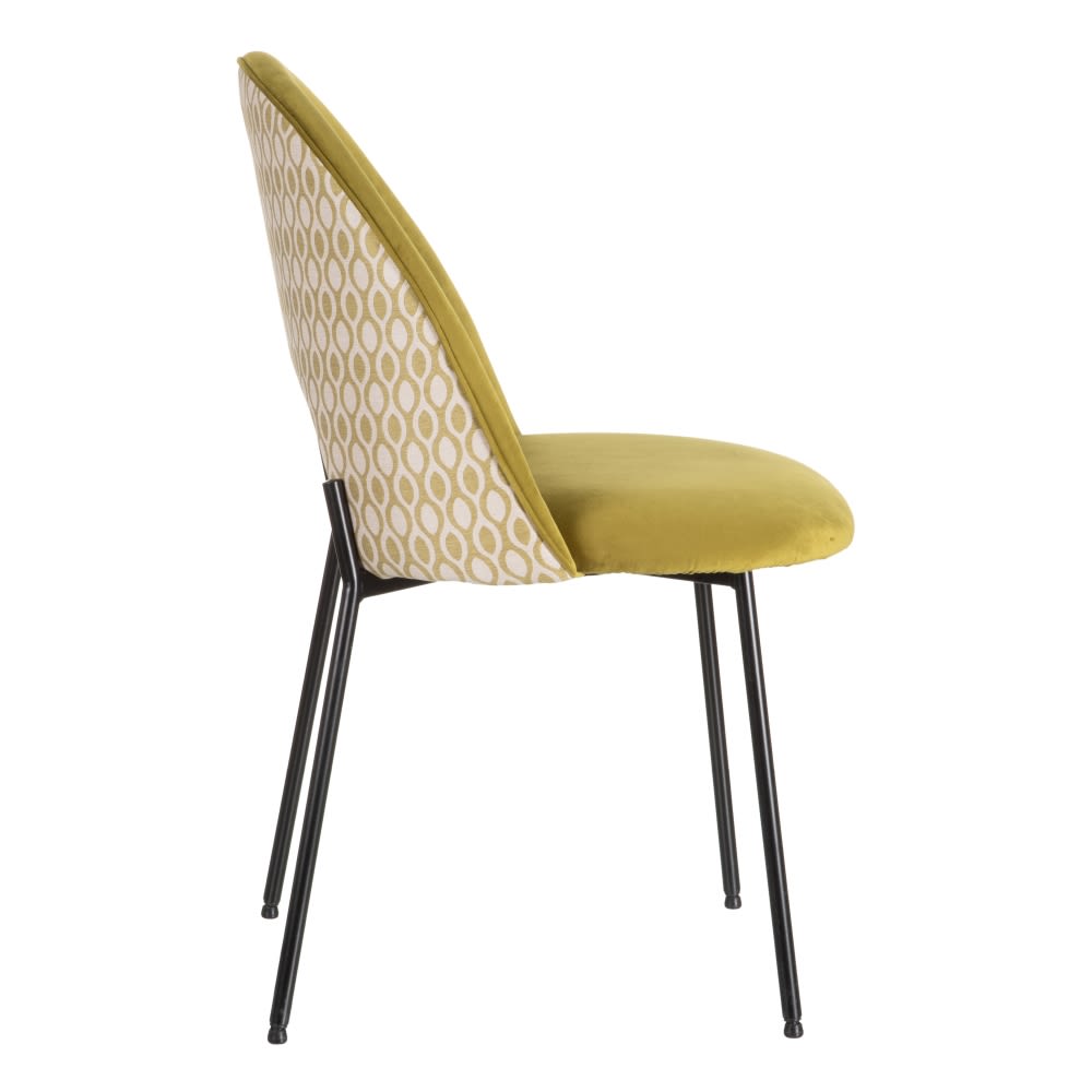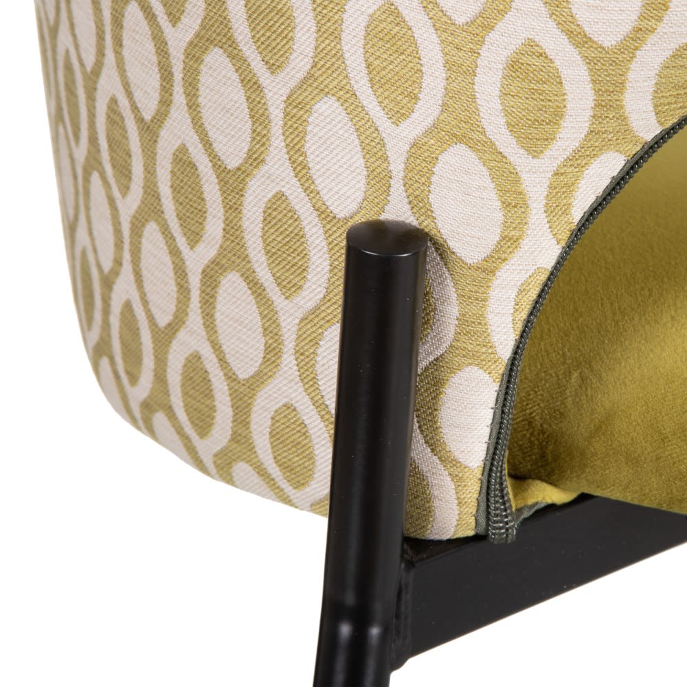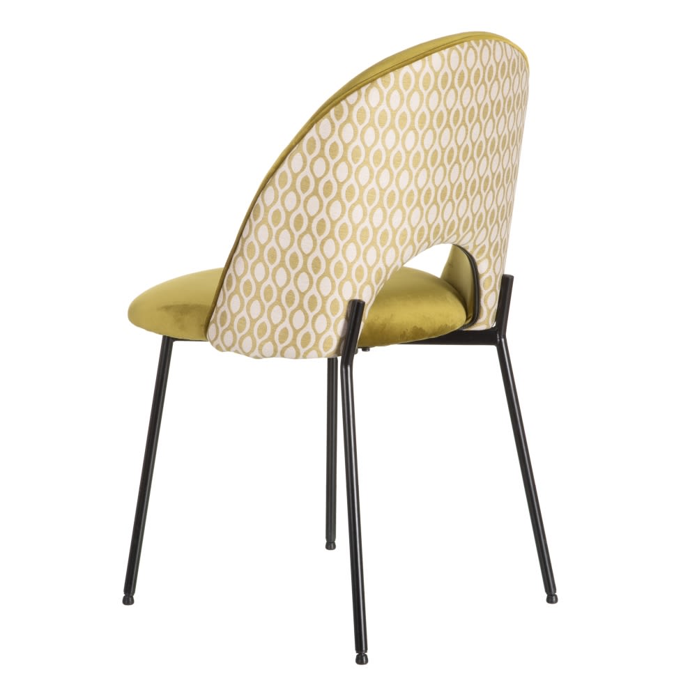 Elegante y original silla de diseño vintage con patas de metal en color negro y tapizado en tonos verdes, con estampado geométrico en la parte trasera del respaldo.