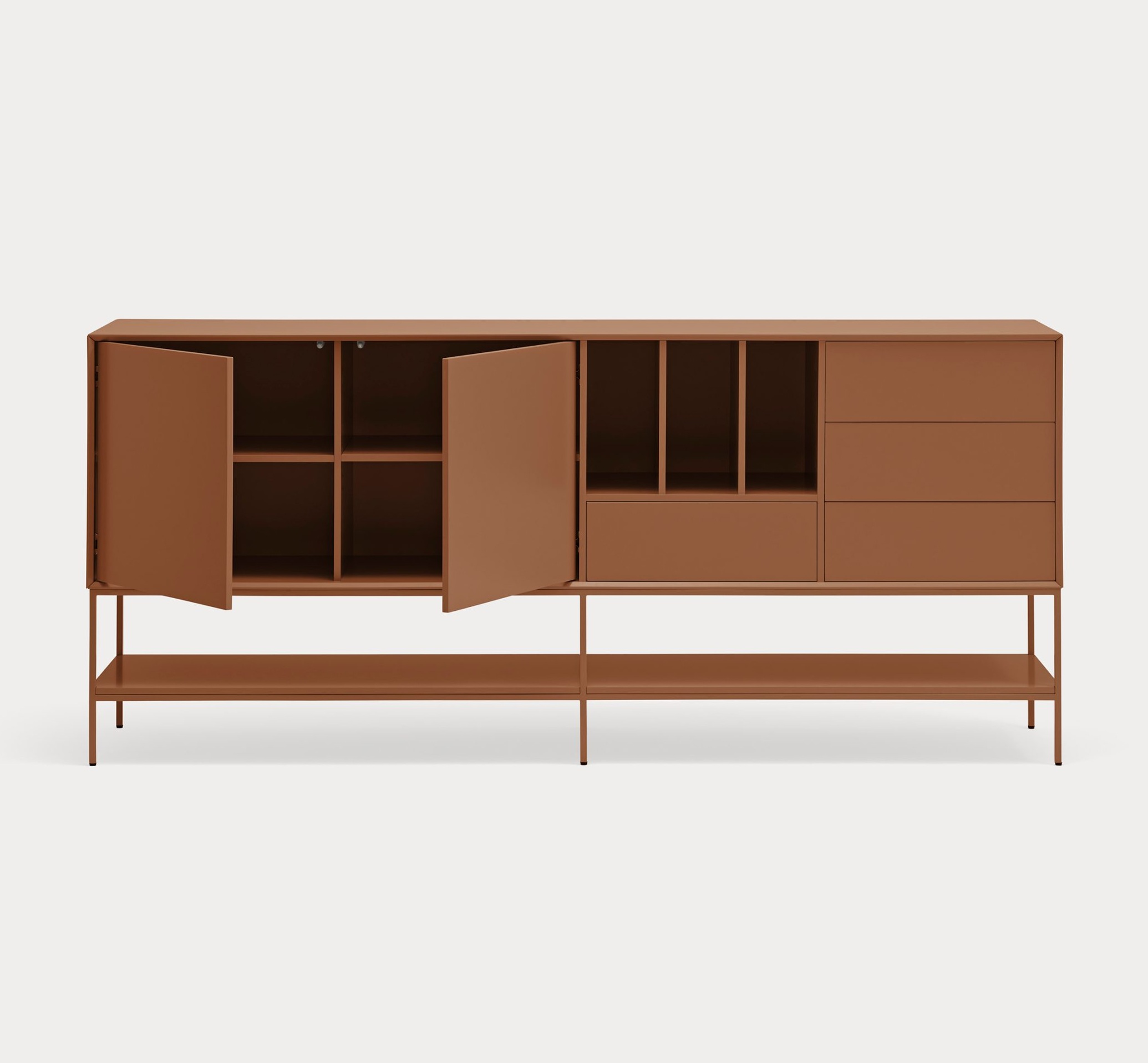 Delicioso y estilizado mueble aparador de líneas rectas y gran practicidad gracias a sus puertas, cajones y huecos abiertos lacado color arcilla sobre sus características patas altas de metal.