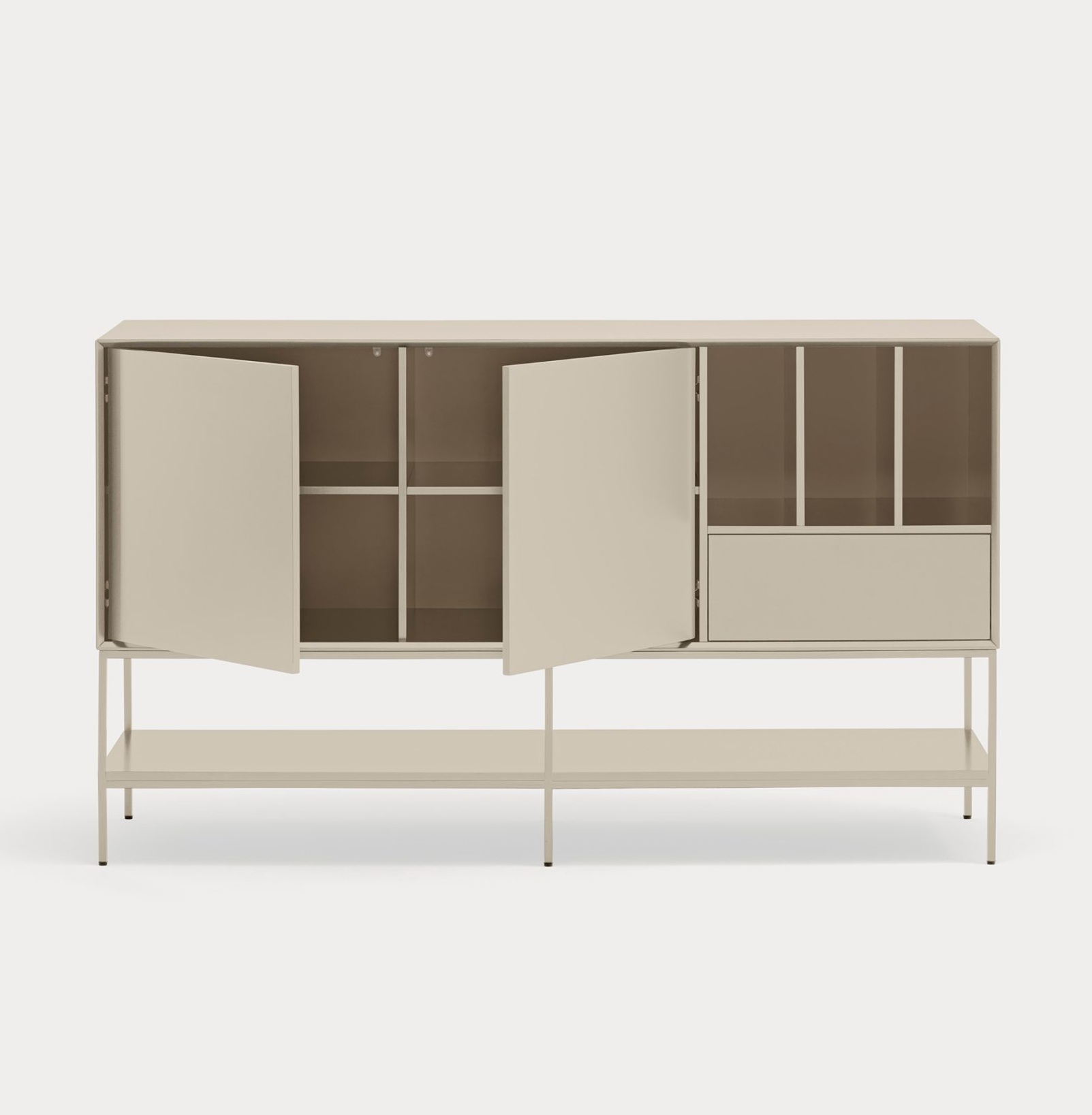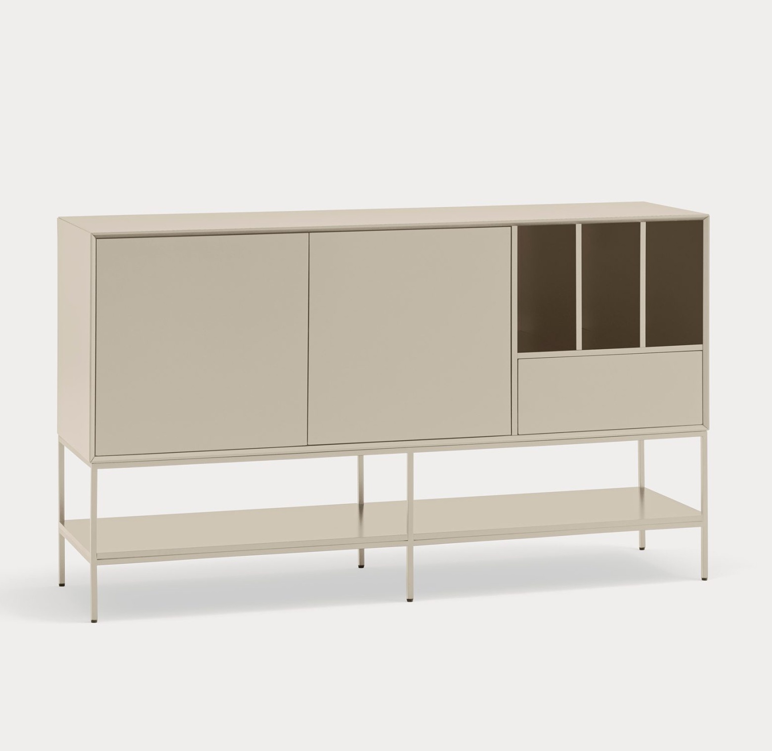 Delicioso y estilizado mueble aparador de líneas rectas y gran practicidad gracias a sus puertas, cajón y huecos abiertos lacado color arena sobre sus características patas altas de metal.