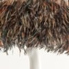 Original lámpara de pie de estilo étnico fabricada en madera tropical acabado color blanco y plumas marrones.