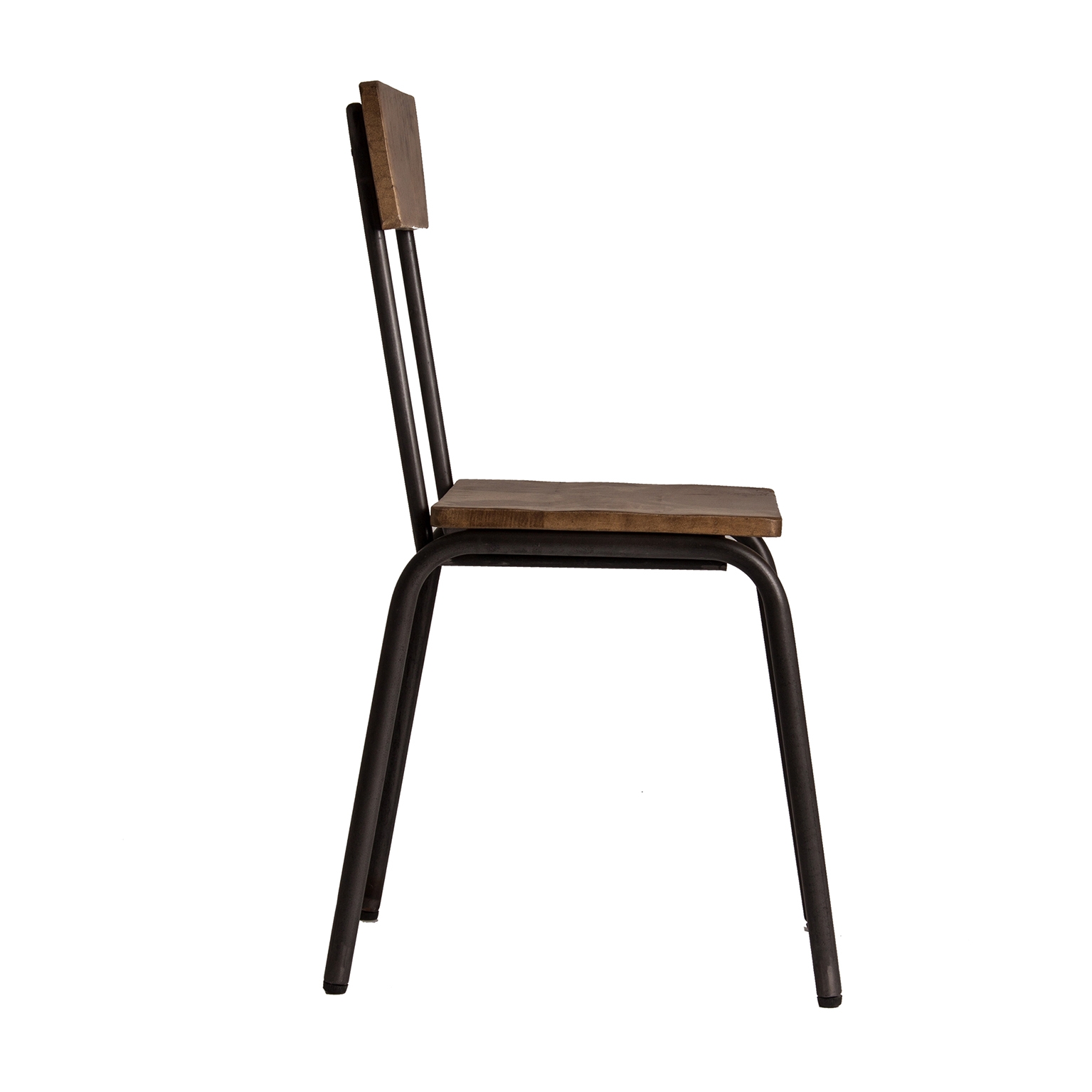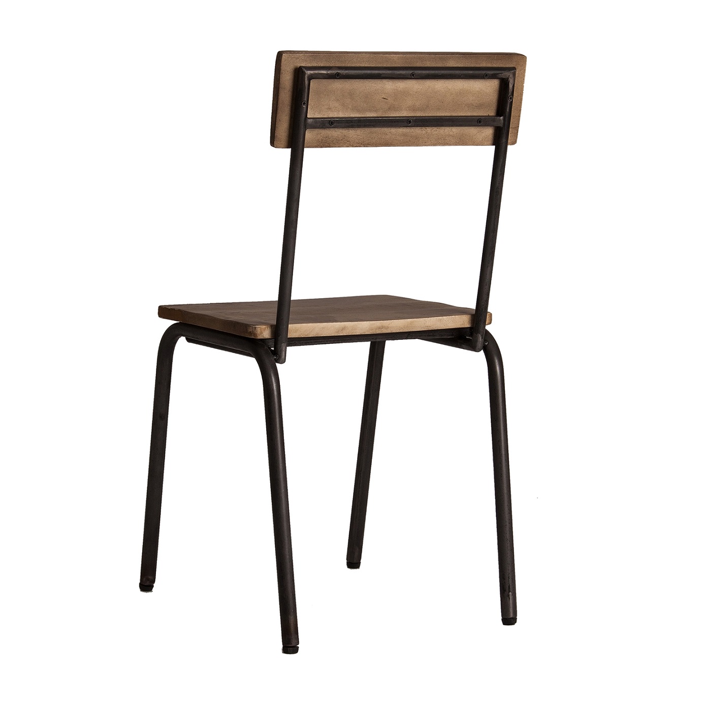 Elegante silla de diseño industrial con estructura de hierro en elegante color negro y asiento y respaldo de madera de mango en color natural.