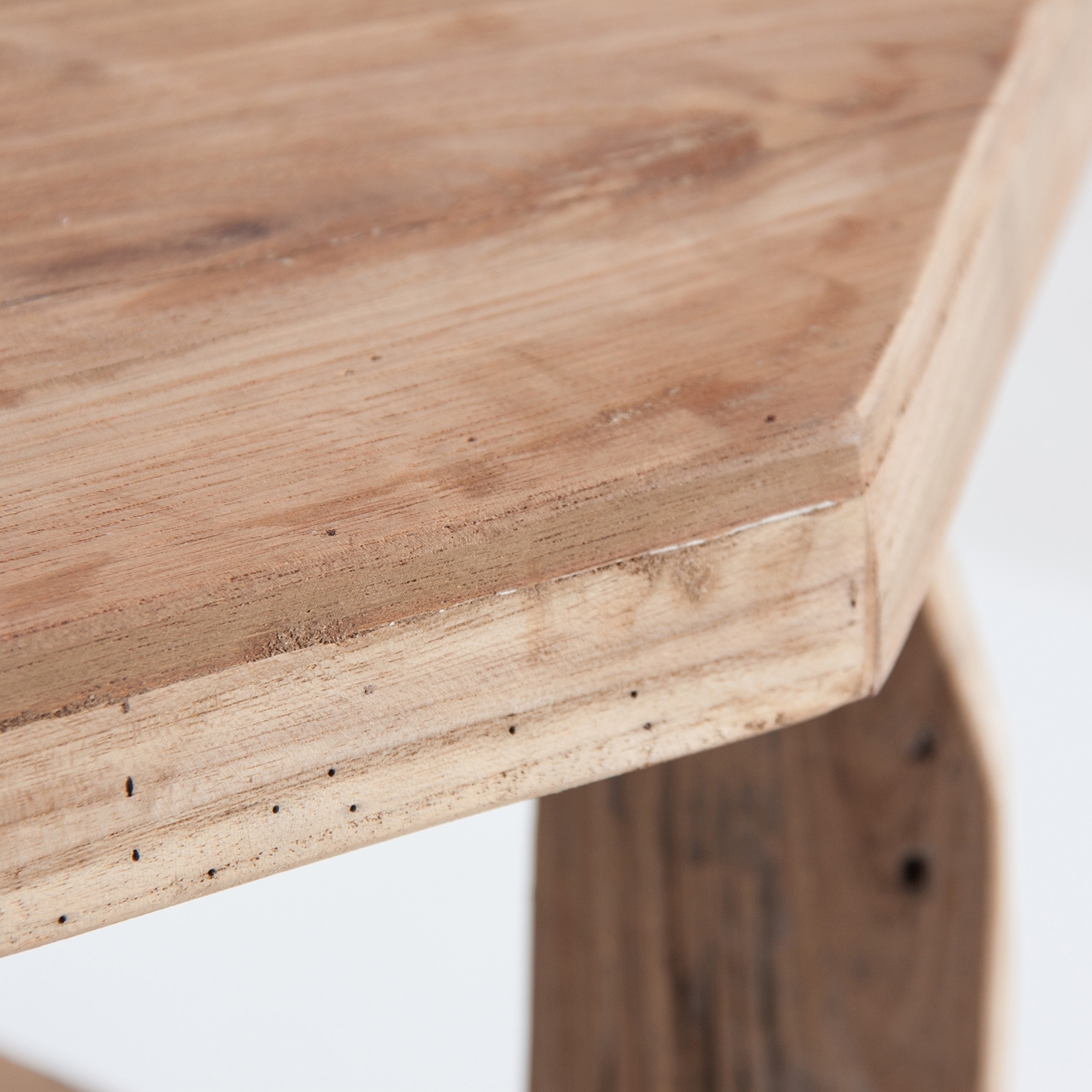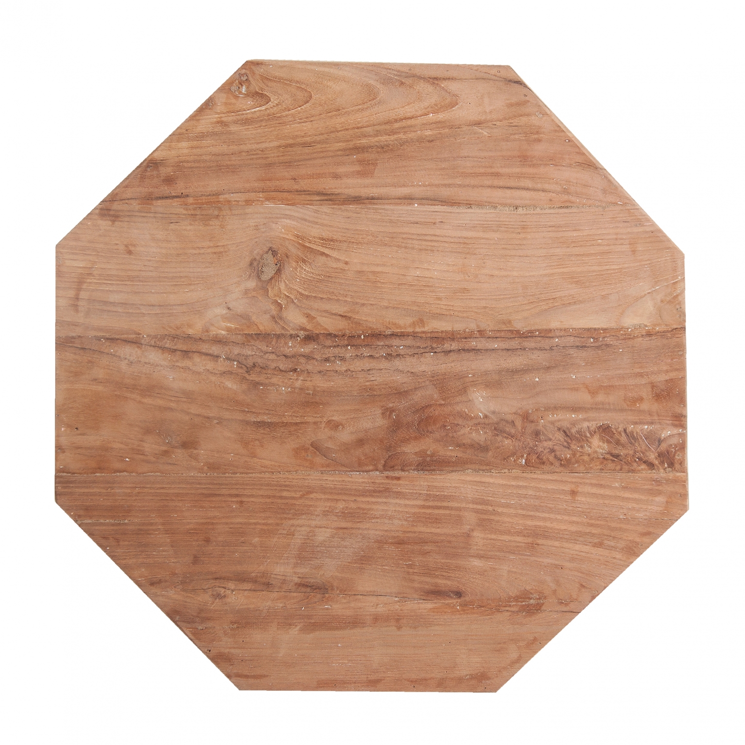 Sencilla y elegante mesa auxiliar de diseño rústico fabricada en madera tropical con elegante acabado natural envejecido y con singular tapa con forma octogonal.