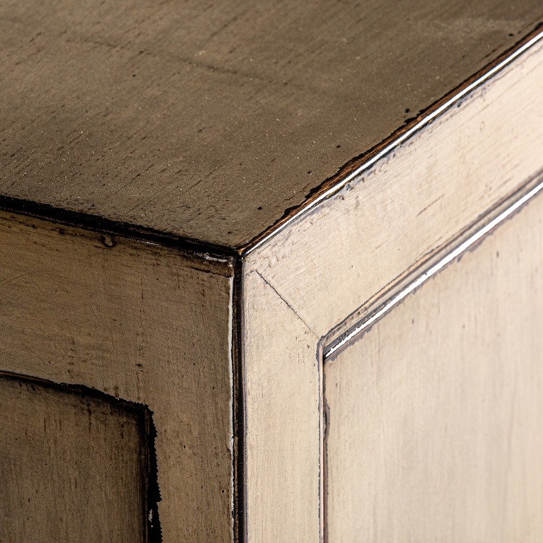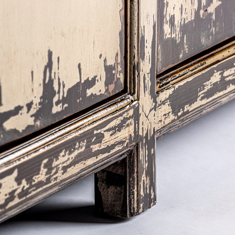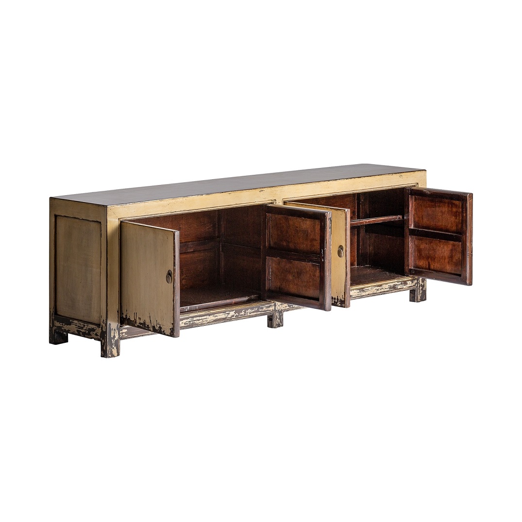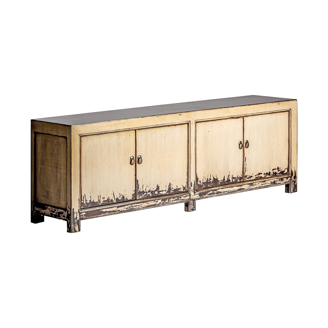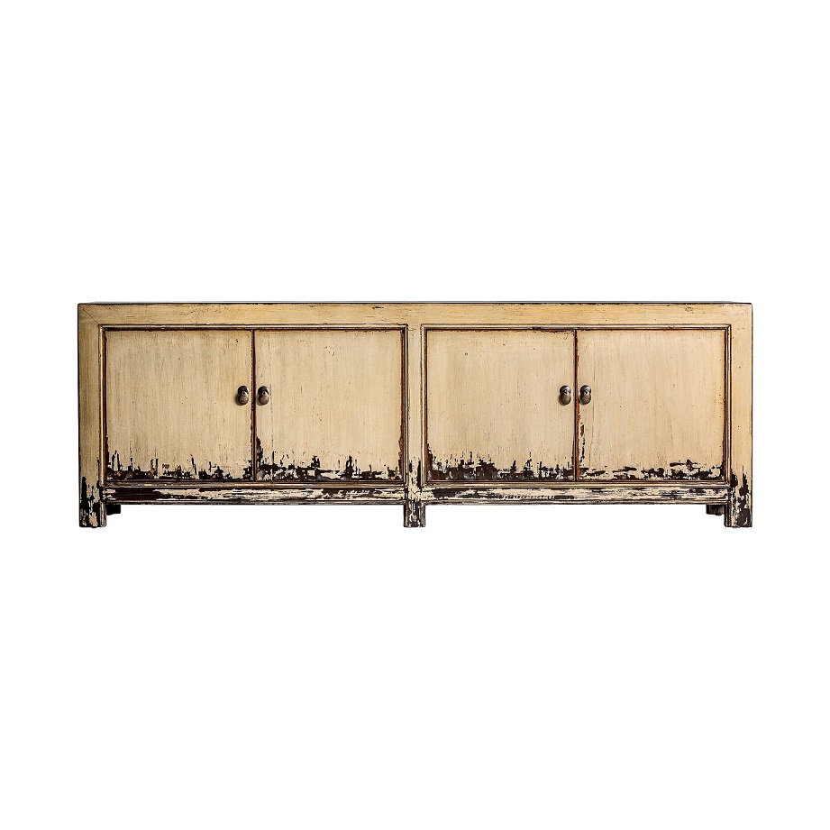 Soberbio aparador de diseño oriental e inspiración rústica fabricado en madera de olmo con bonito acabado en color beige con marcados desgastes, cuenta con cuatro puertas decoradas con sencillos tiradores de metal y baldas en su interior.