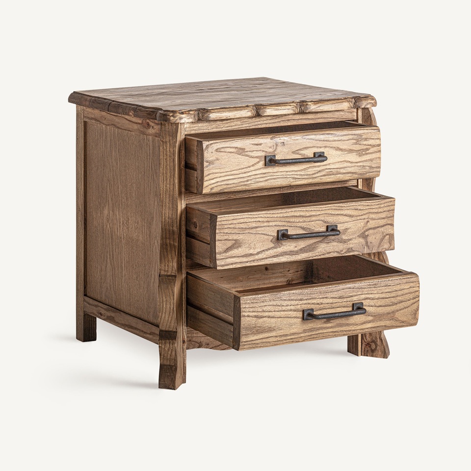 Irresistible mesita de noche, de diseño rústico e inspiración vintage, fabricada en madera de olmo con bonito acabado en color natural envejecido y 3 prácticos cajones con tiradores metálicos.