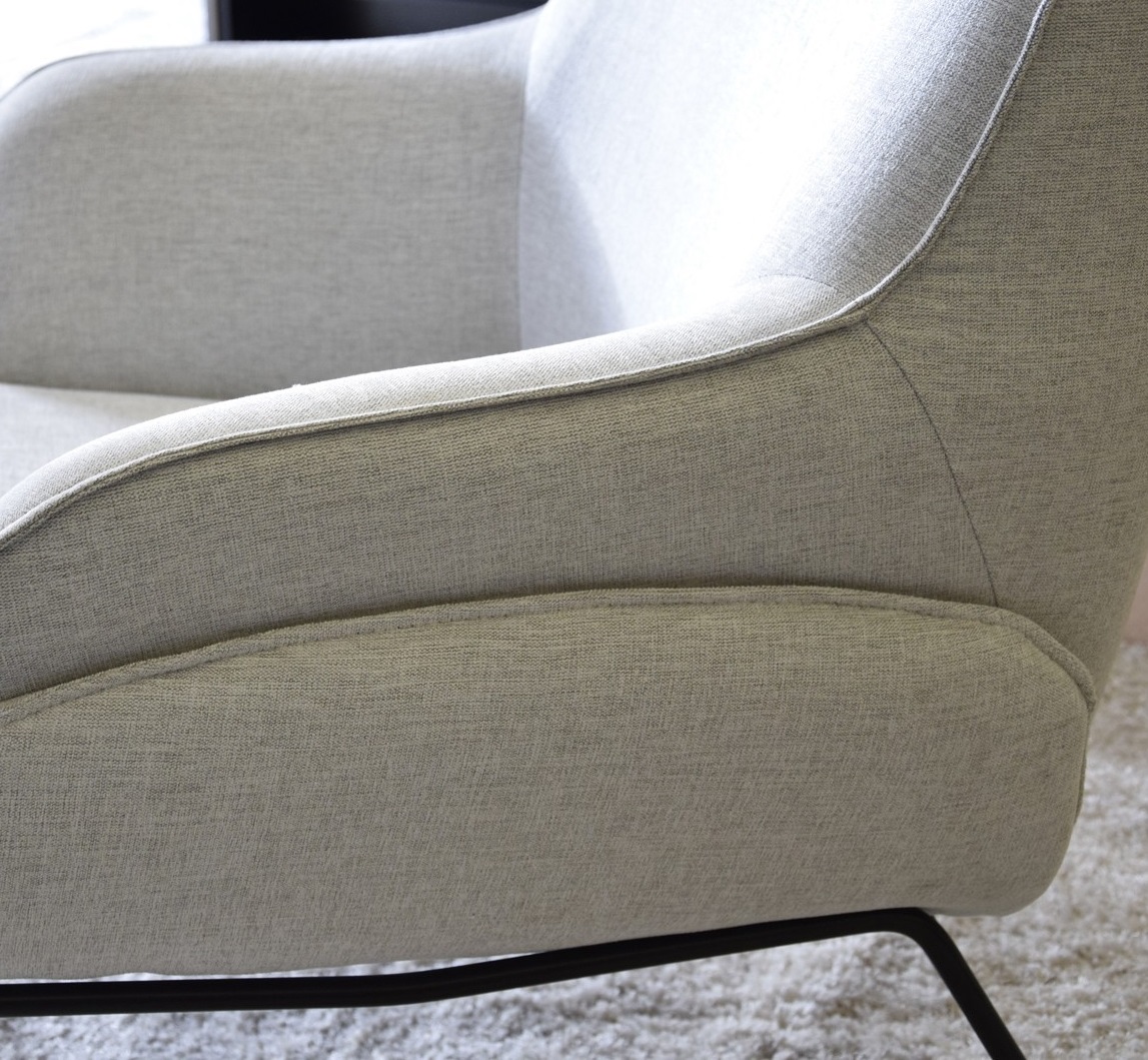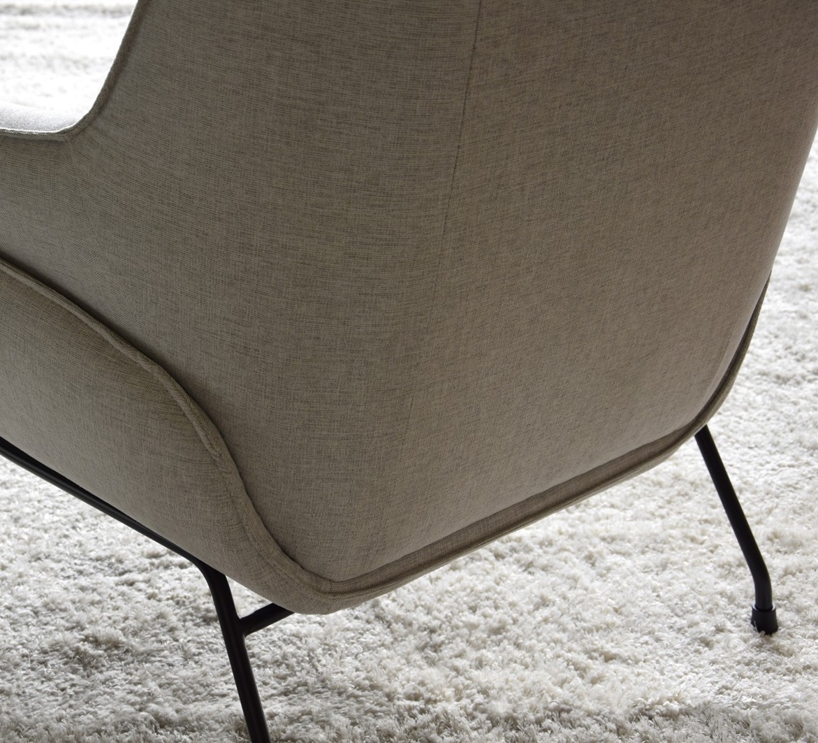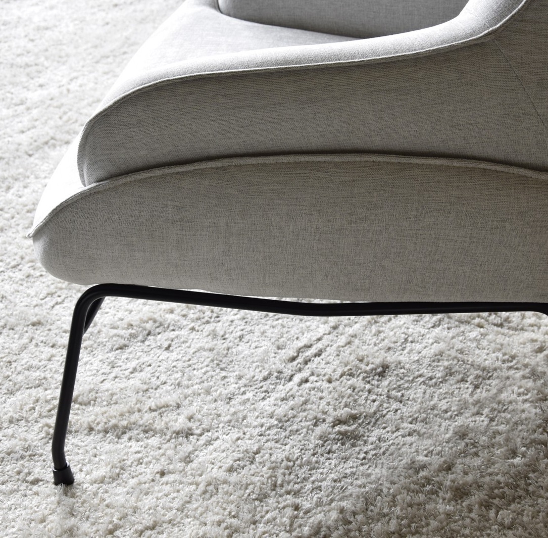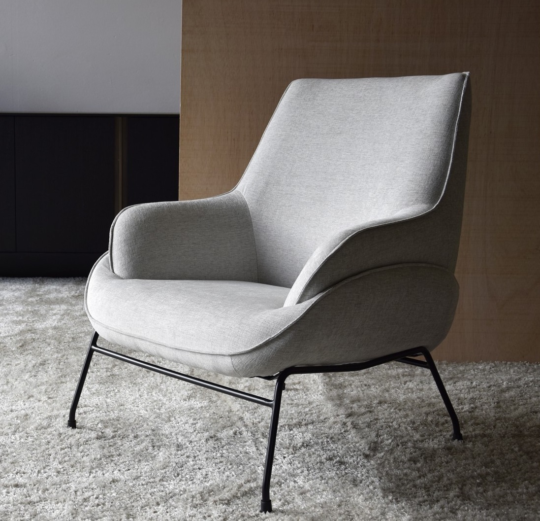Deliciosa butaca de diseño moderno e inspiración nórdica tapizada en tela color gris claro sobre estructura de patas metálicas en negro.