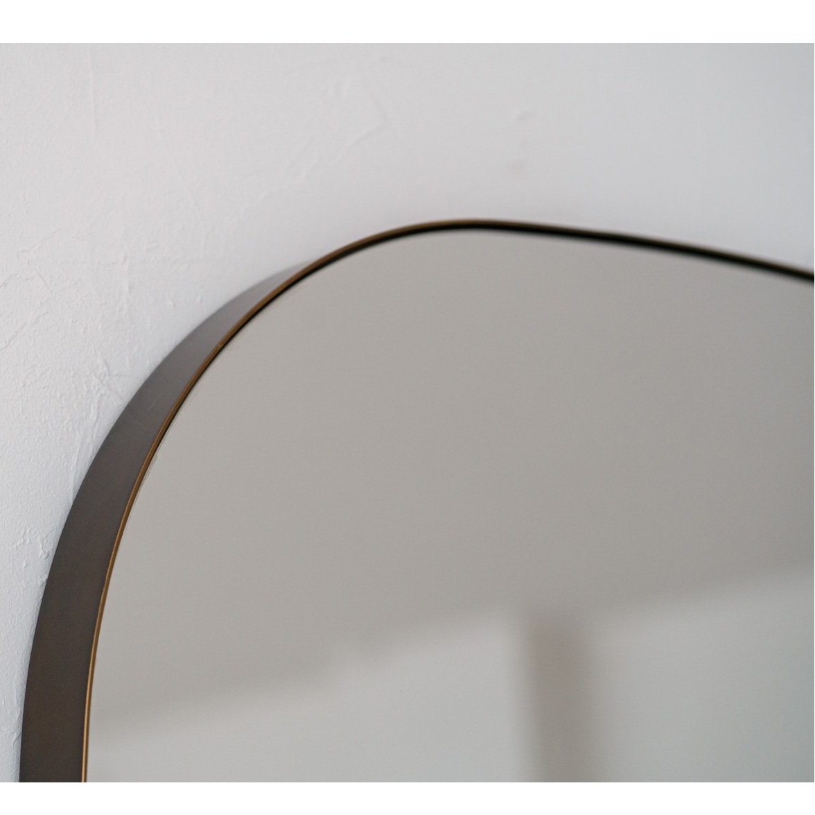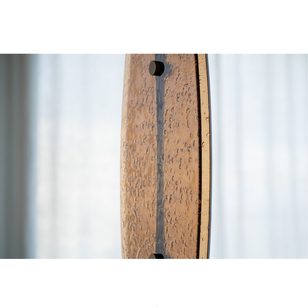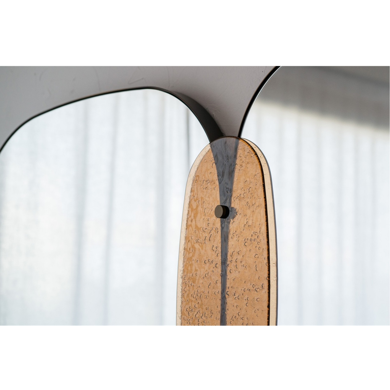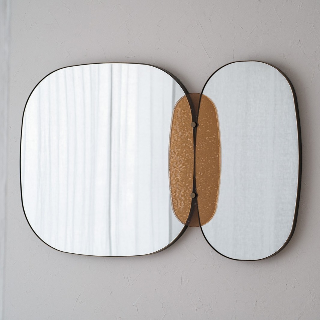 Precioso y original espejo de pared, de diseño moderno, compuesto por dos piezas con marco de metal acabado dorado envejecido y detalle de vidrio texturizado color ámbar en el centro.