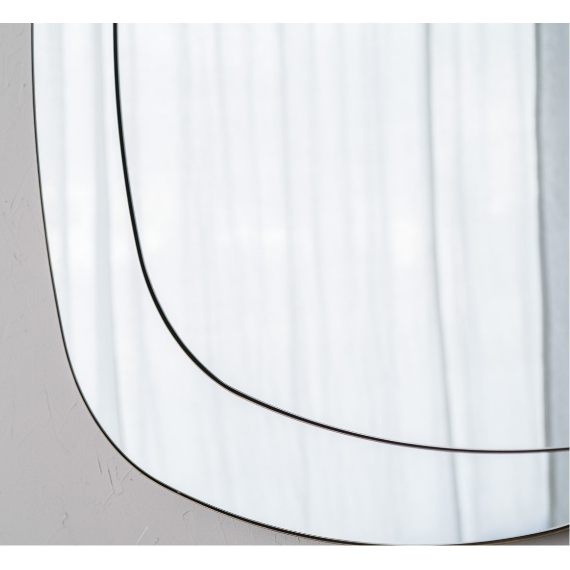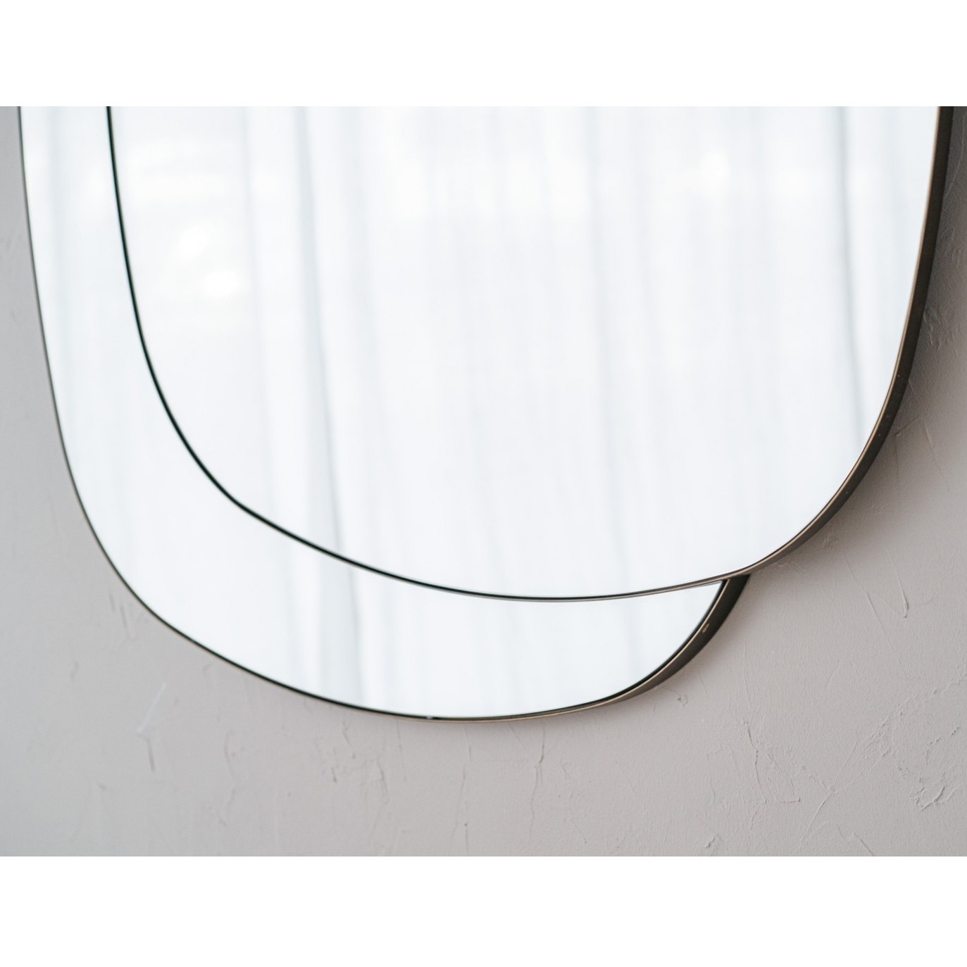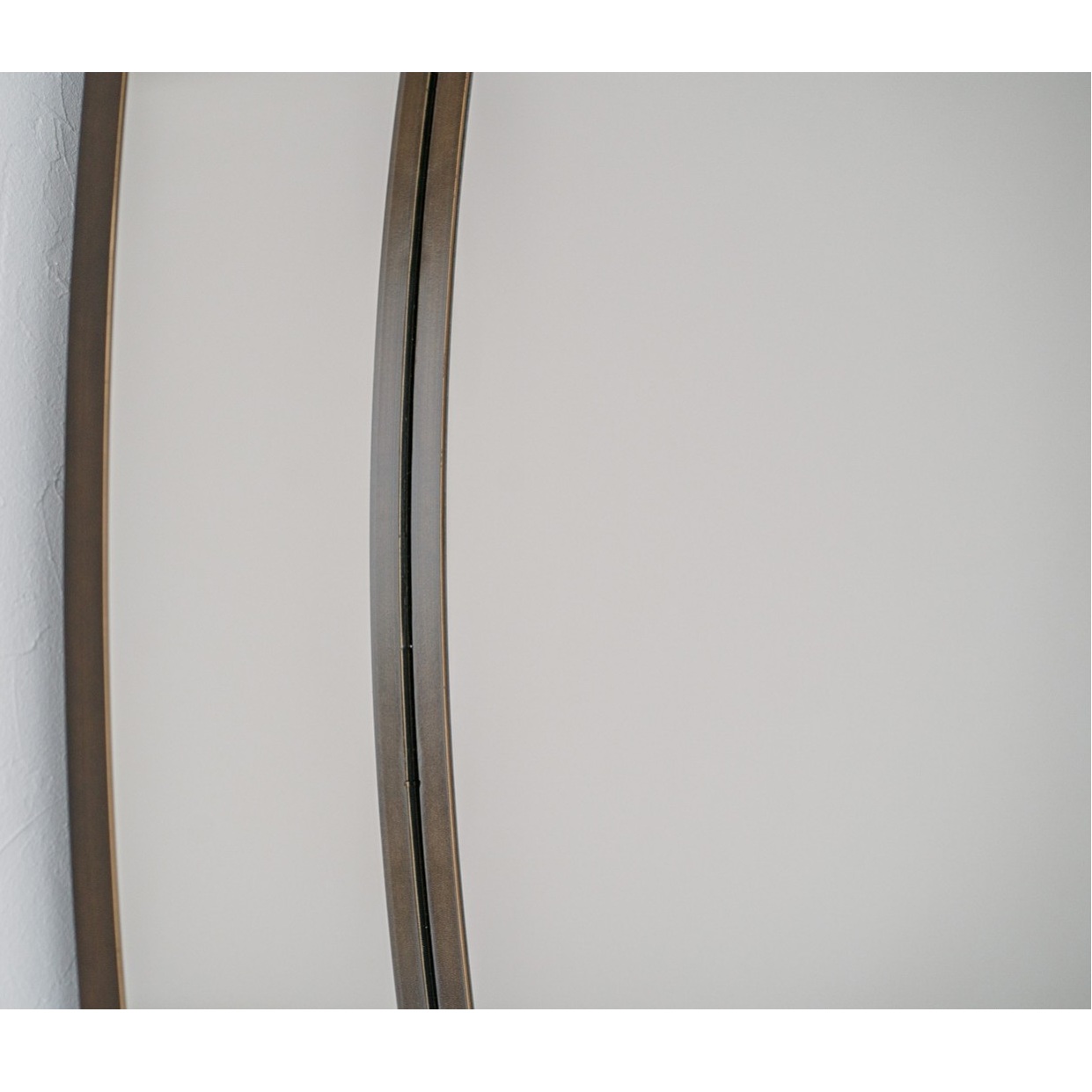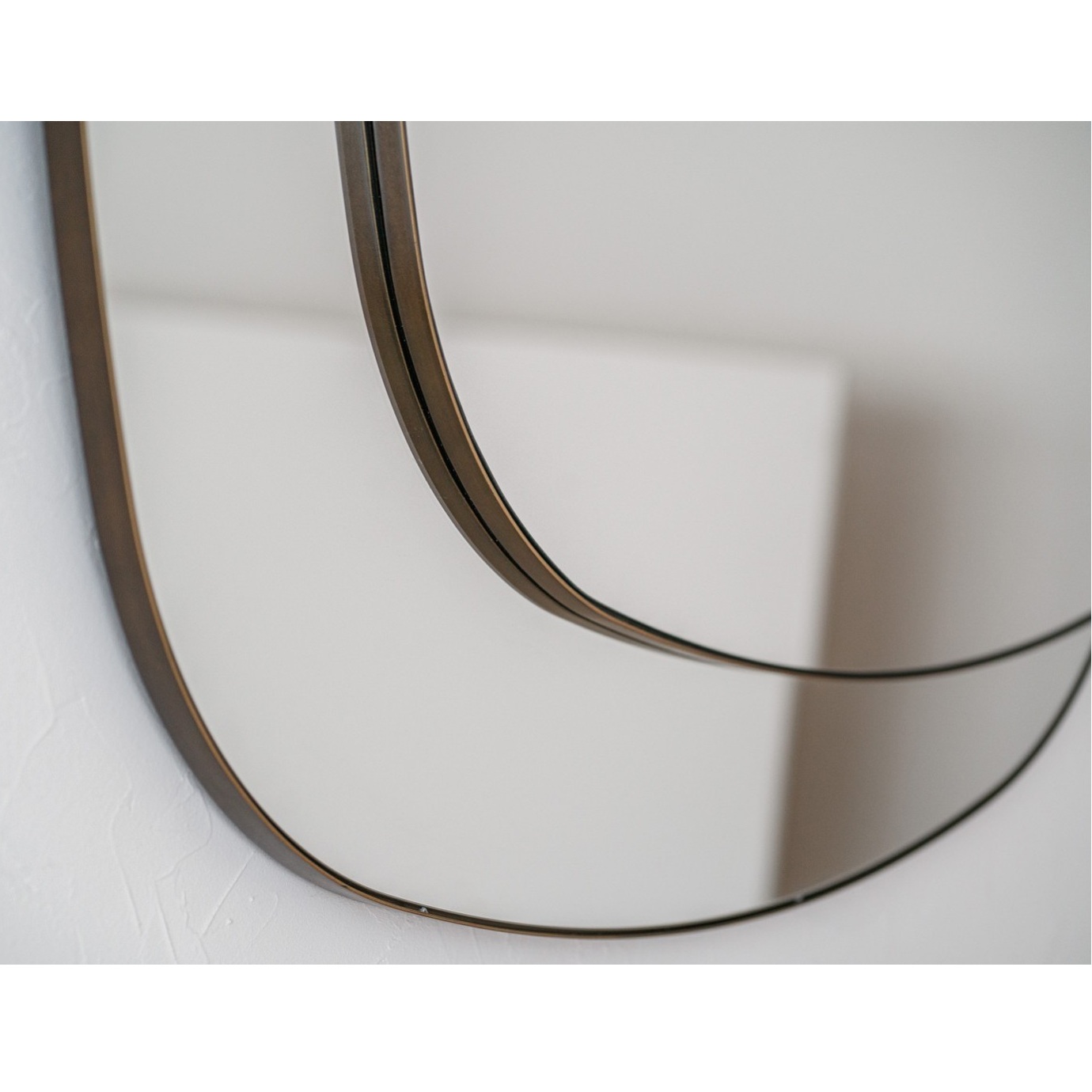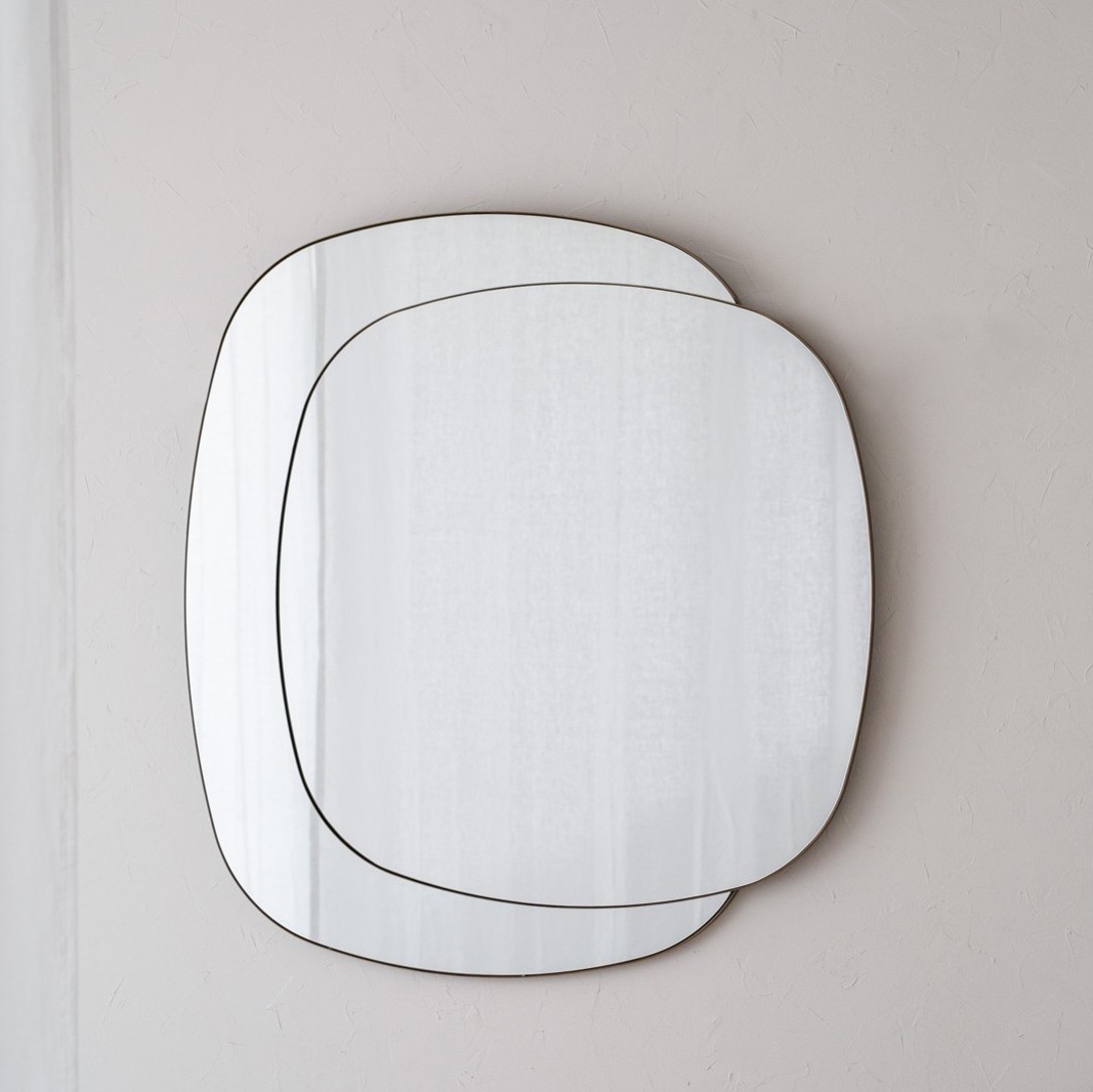 Elegante y original espejo de pared, de diseño moderno, compuesto por dos piezas paralelas y ligeramente desplazadas entre sí con marco de metal acabado dorado envejecido.