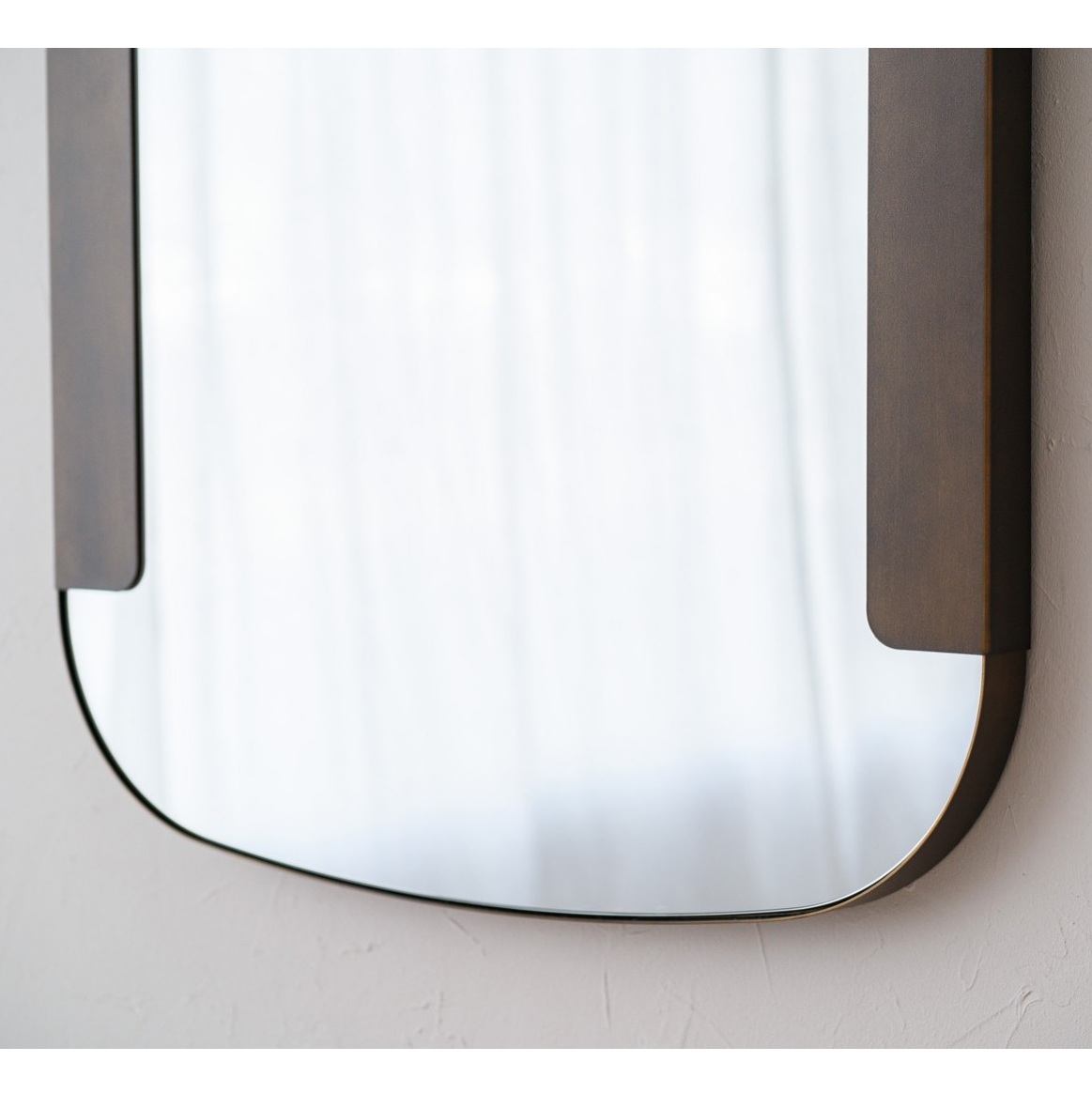 Elegante espejo de pared rectangular, de diseño moderno, con marco de metal en color dorado envejecido con esquinas redondeadas.