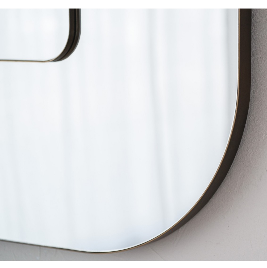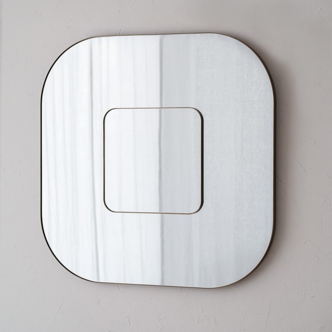 Elegante espejo de pared, de diseño moderno, formado por dos piezas cuadradas superpuestas y marco de metal acabado dorado envejecido con bordes redondeados.