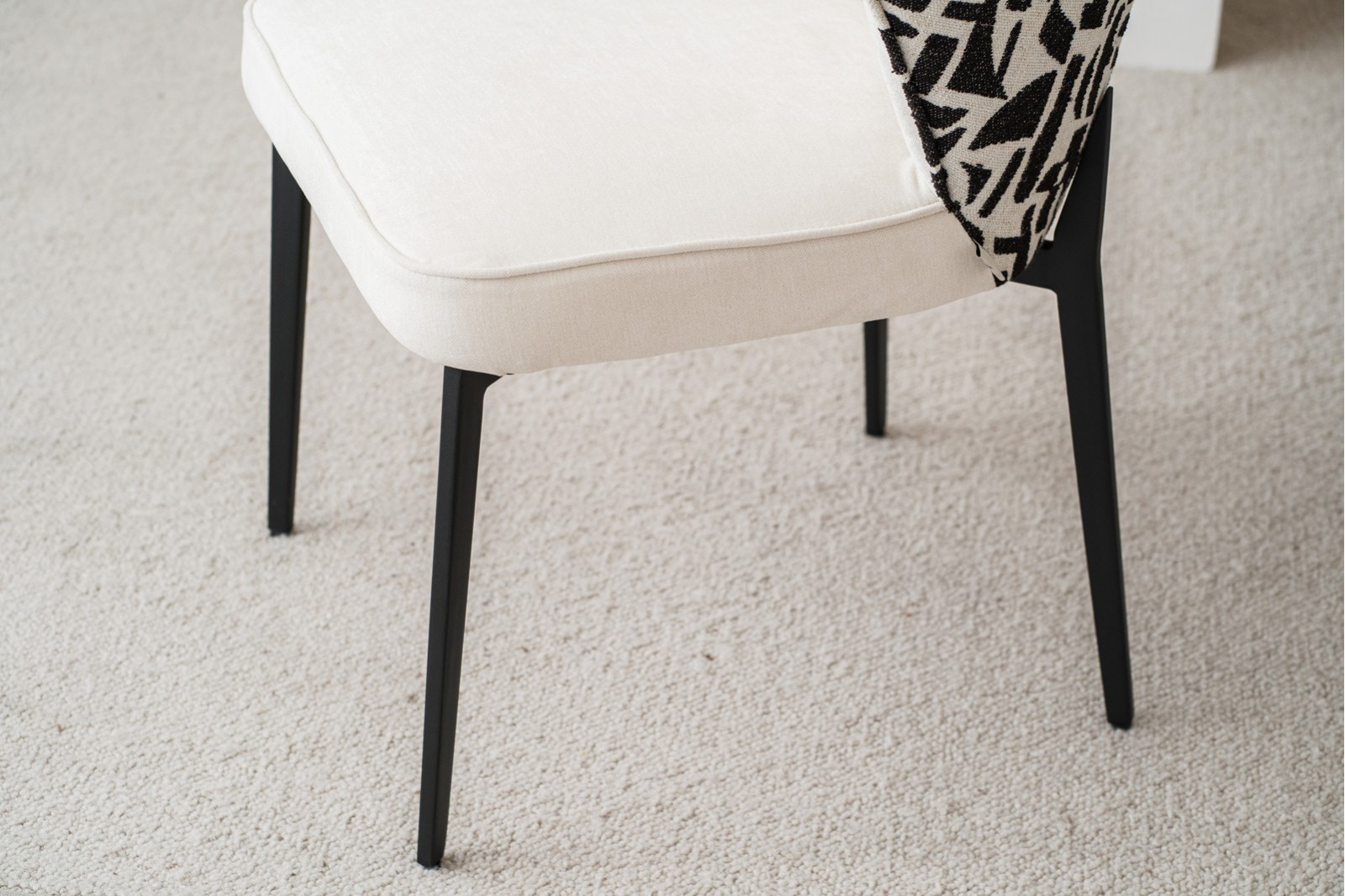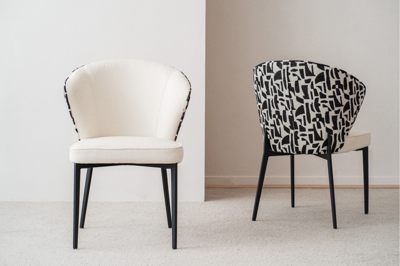 Sofisticada silla de diseño moderno tapizada en tejido aterciopelado en tono marfil claro en asiento e interior de respaldo combinado con tela de textura más gruesa y estampado geométrico en tonos beige y negro en trasera sobre estructura de metal acabado negro mate.