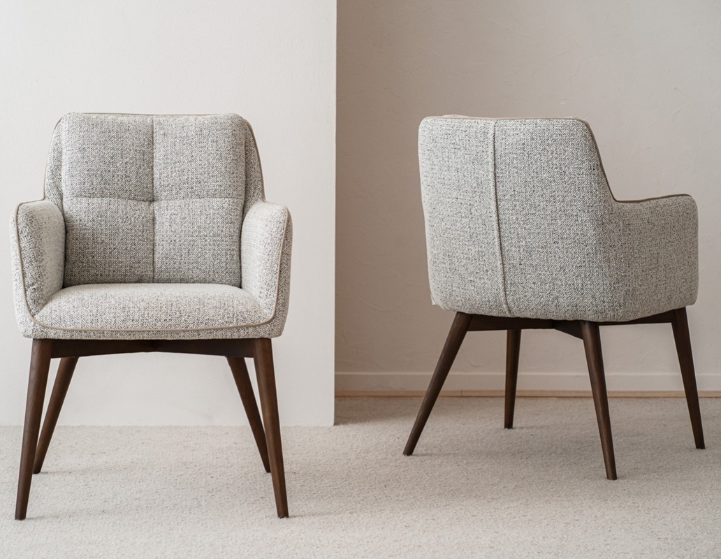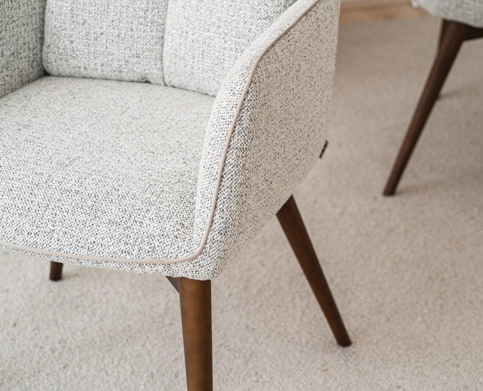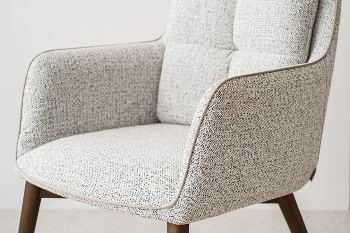 Sofisticada silla de diseño moderno con reposabrazos tapizada en tejido con textura en tonos grises con vivo decorativo hecho en terciopelo sobre estructura de patas de madera maciza de fresno teñidas en tono nogal.