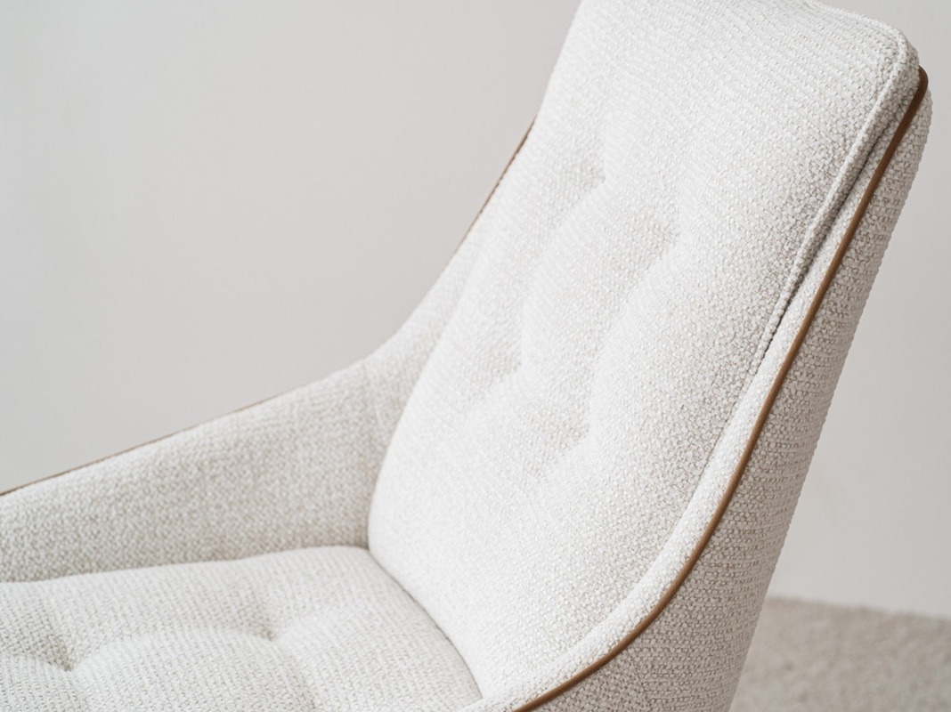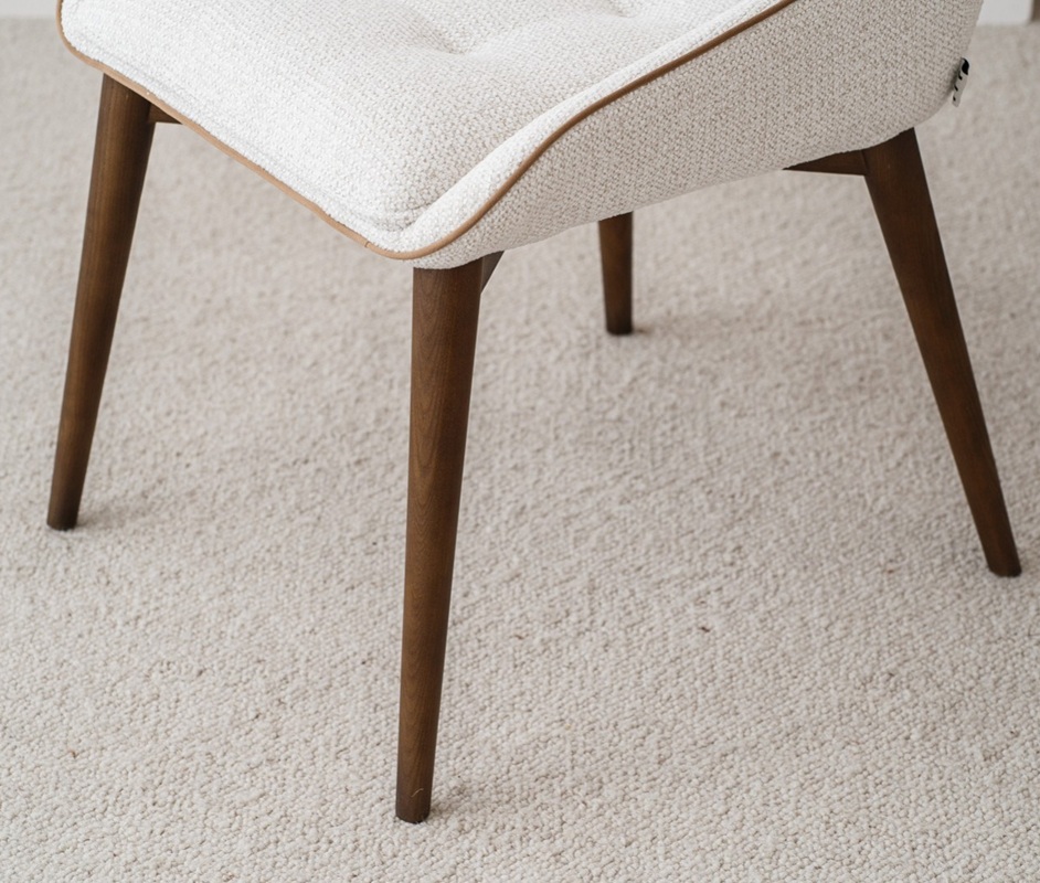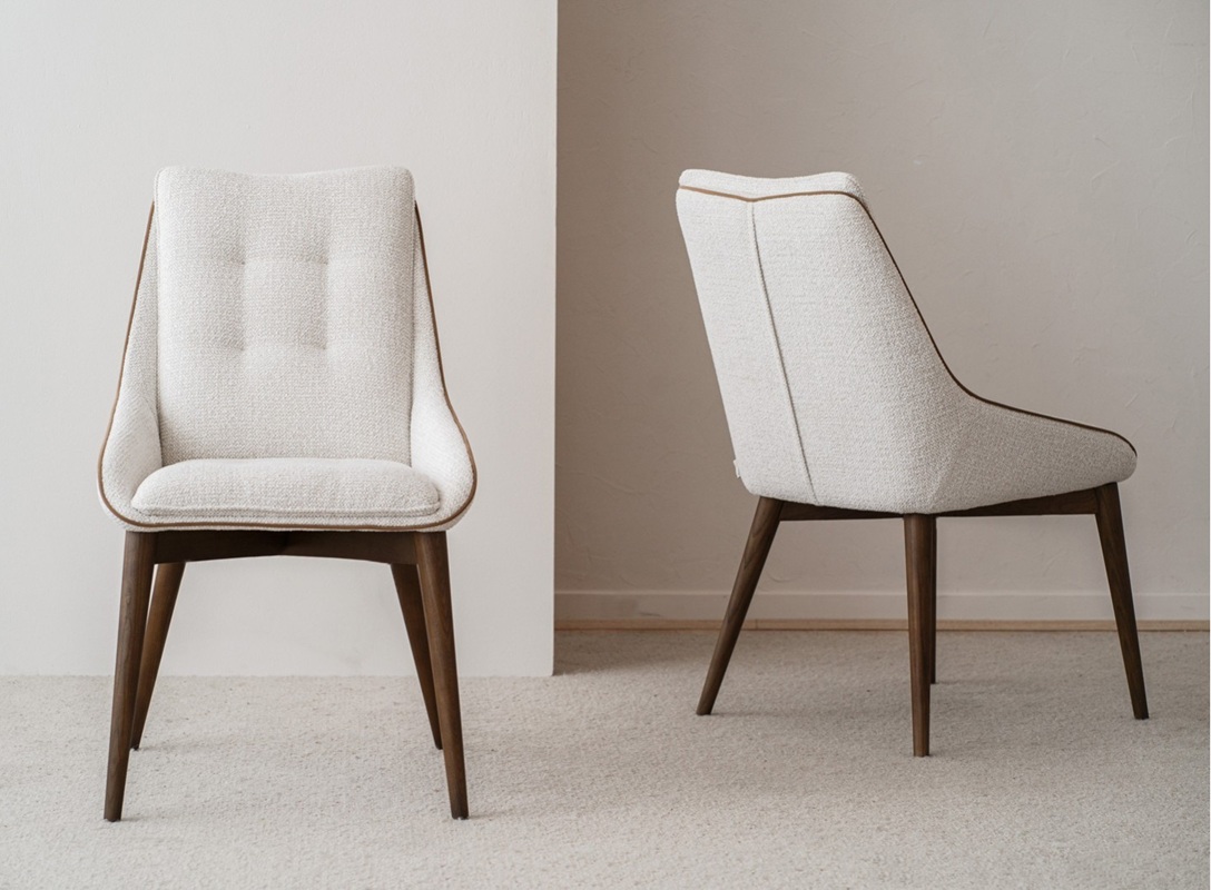 Sofisticada silla de diseño moderno tapizada en tejido con textura en tonos marfil que resalta su aspecto mullido con vivo decorativo hecho en terciopelo sobre estructura de patas de madera maciza de fresno teñidas en tono nogal.