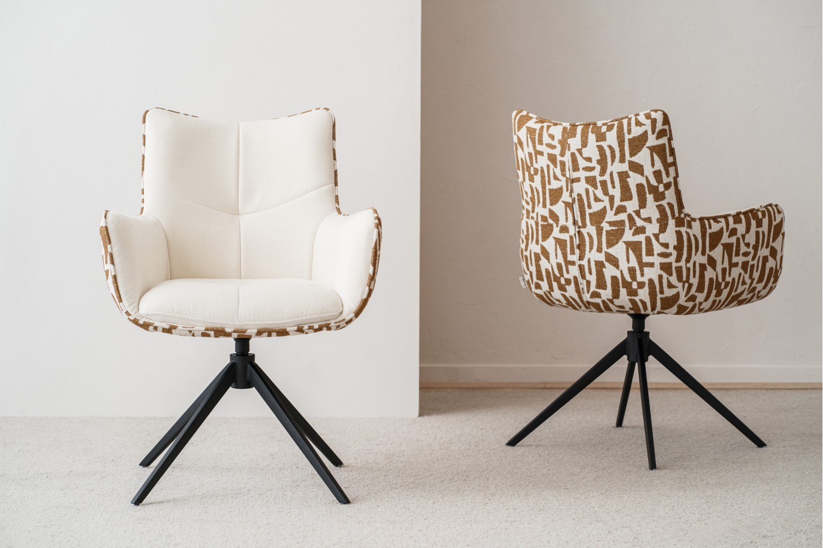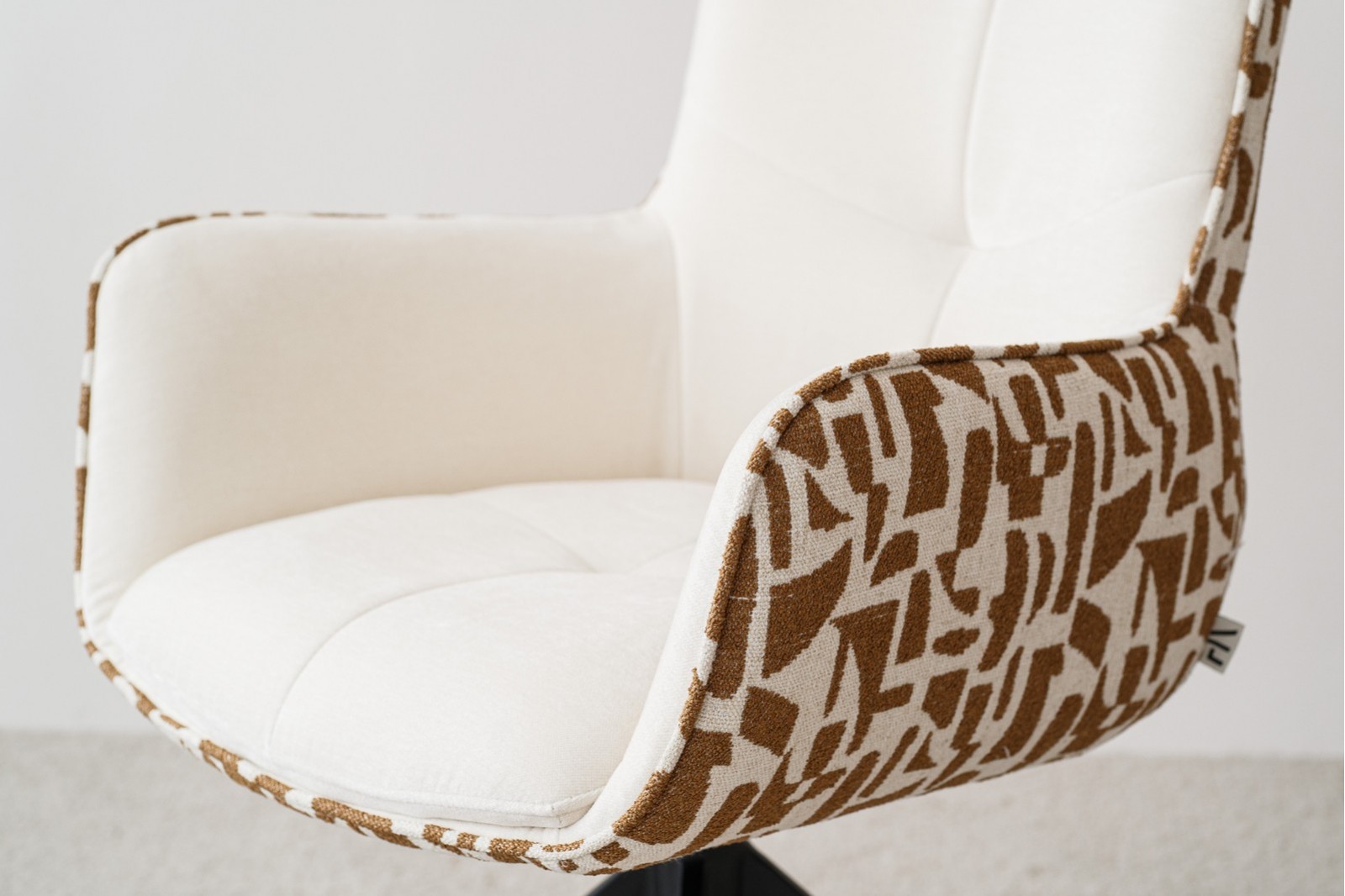 Sofisticada silla giratoria con reposabrazos de diseño moderno tapizada en tejido aterciopelado en tono marfil claro en su interior combinado con tela de textura más gruesa y estampado geométrico en tonos claros y ocres en trasera sobre estructura giratoria de patas de metal acabado negro mate.