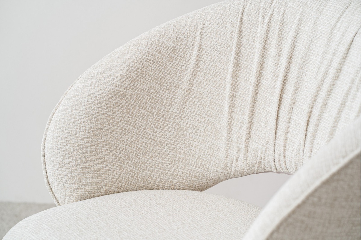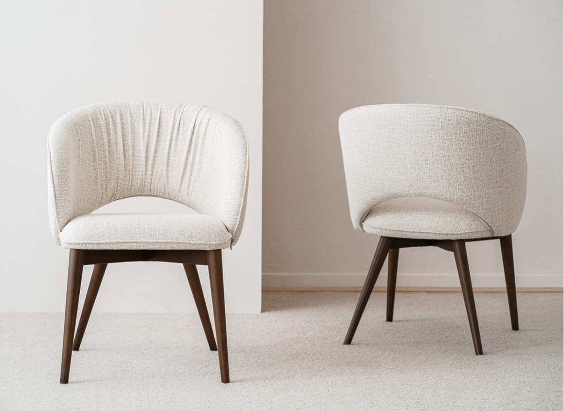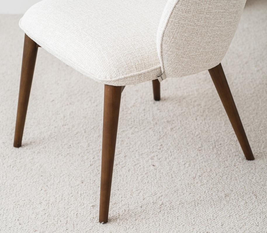 Sofisticada silla de diseño moderno y formas redondeadas tapizada en tejido en tonos beige y blanco roto sobre estructura de patas de madera maciza de fresno teñidas en tono nogal.