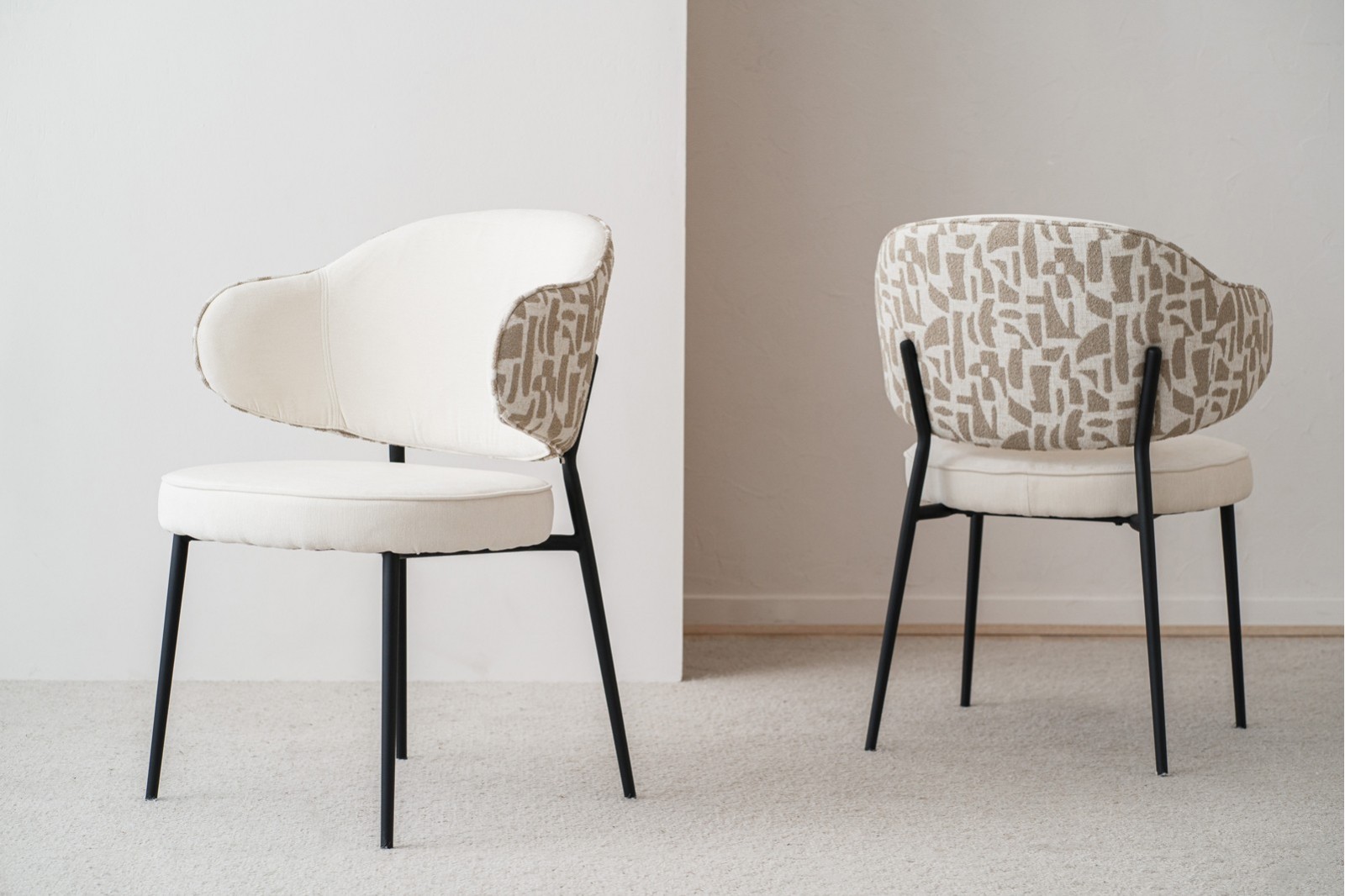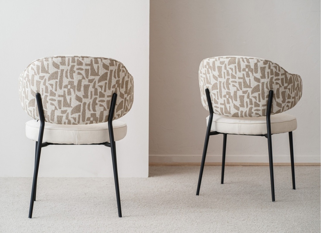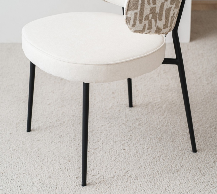 Sofisticada silla de diseño moderno tapizada en tejido aterciopelado en tono beige suave en asiento e interior de respaldo combinado con tela de textura más gruesa y estampado geométrico en tonos beige y piedra en trasera sobre estructura de metal acabado negro mate.