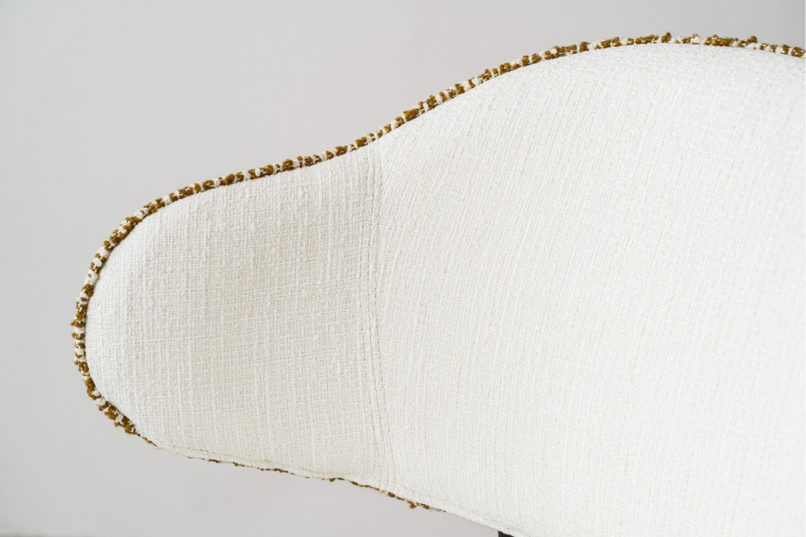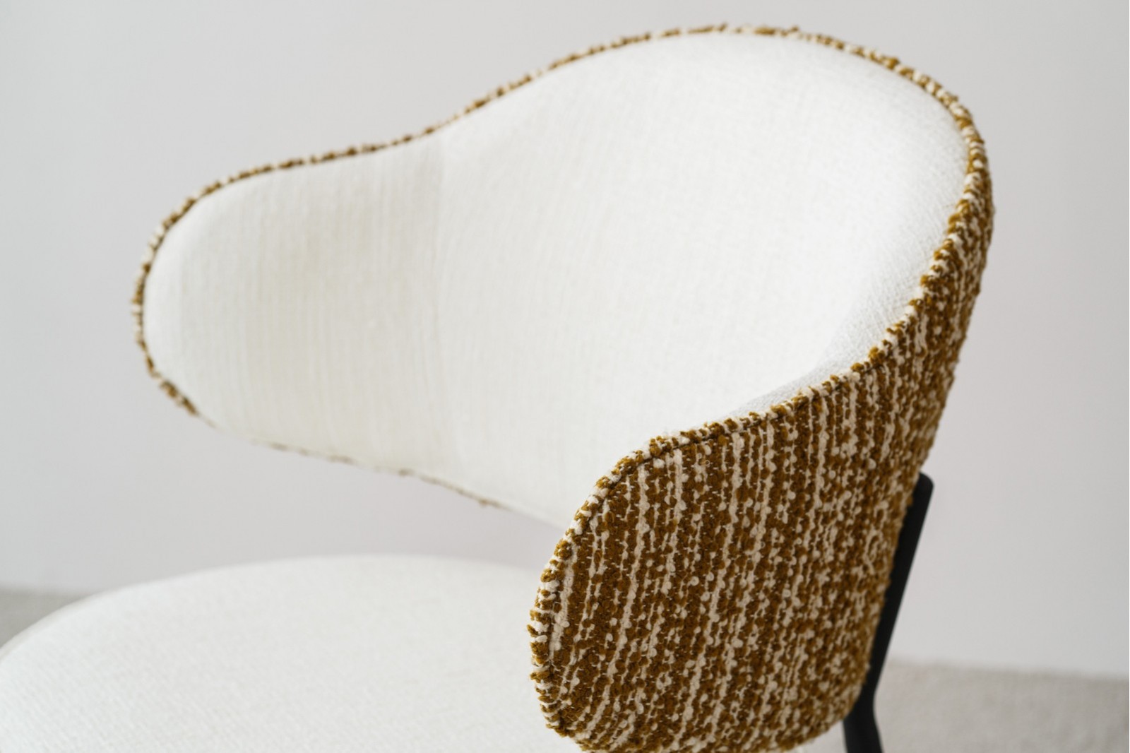 Sofisticada silla de diseño moderno tapizada en tejido en tono blanco roto en asiento e interior de respaldo combinado con tela de textura más gruesa en colores mostaza y blancos en trasera sobre estructura de metal acabado negro mate.