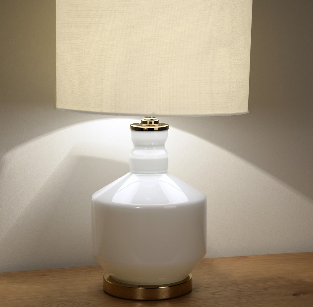 Sofisticada lámpara de sobremesa de diseño clásico realizada en vidrio color blanco y metal acabado oro. La pantalla cilíndrica está realizada en lino color blanco.