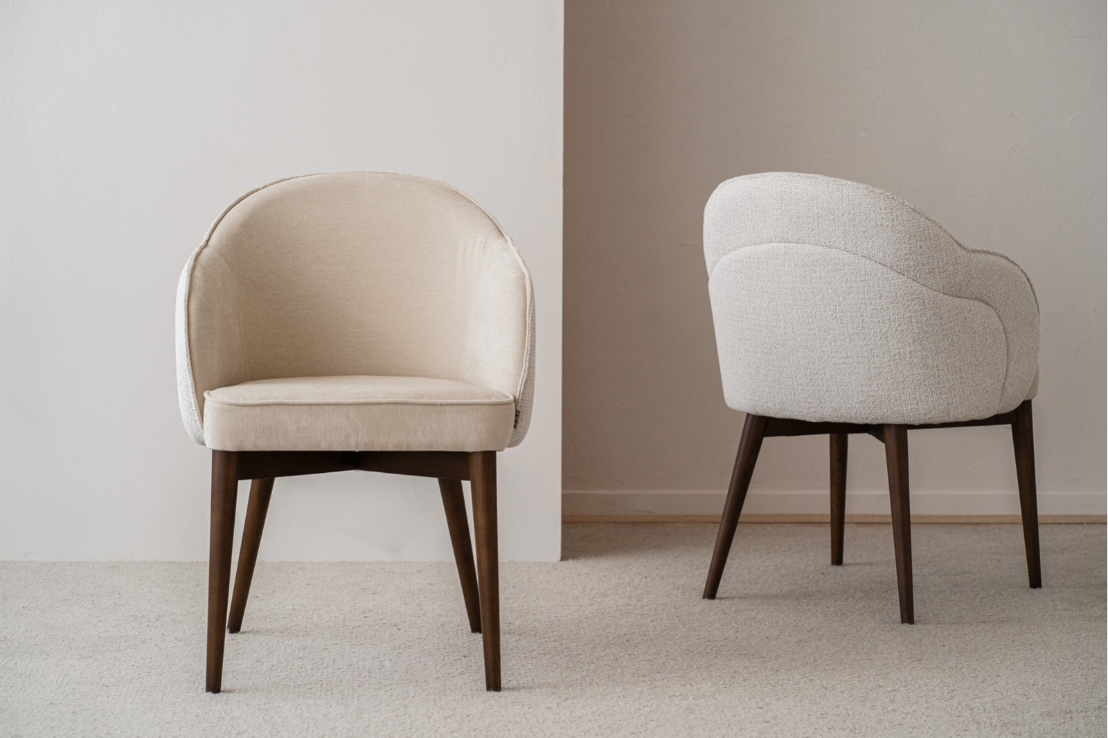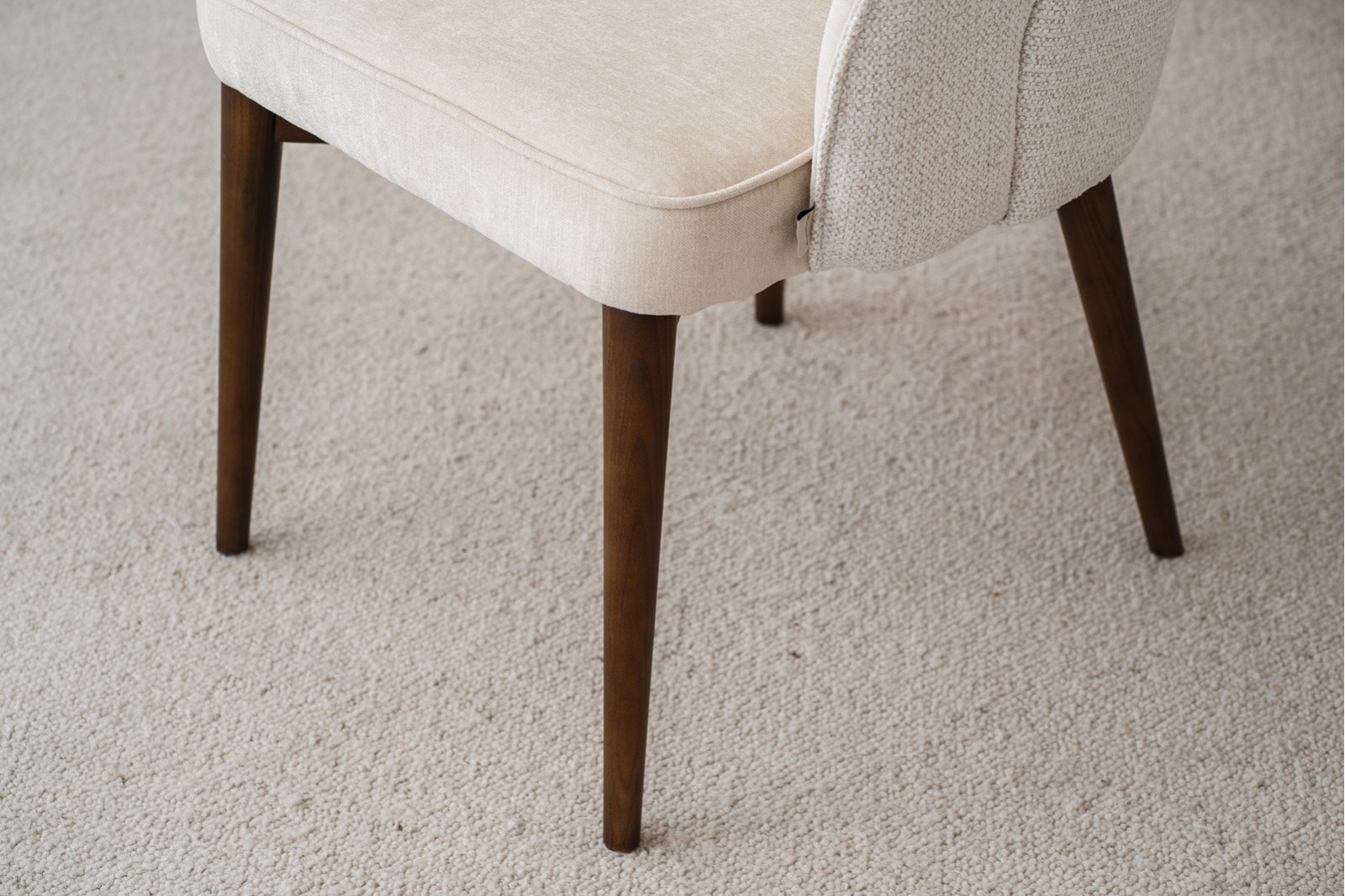 Sofisticada silla de diseño moderno y formas redondeadas tapizada en tejido mas suave en parte interior color marfil y tela con textura en parte trasera sobre estructura de patas de madera maciza de fresno teñidas en tono nogal.