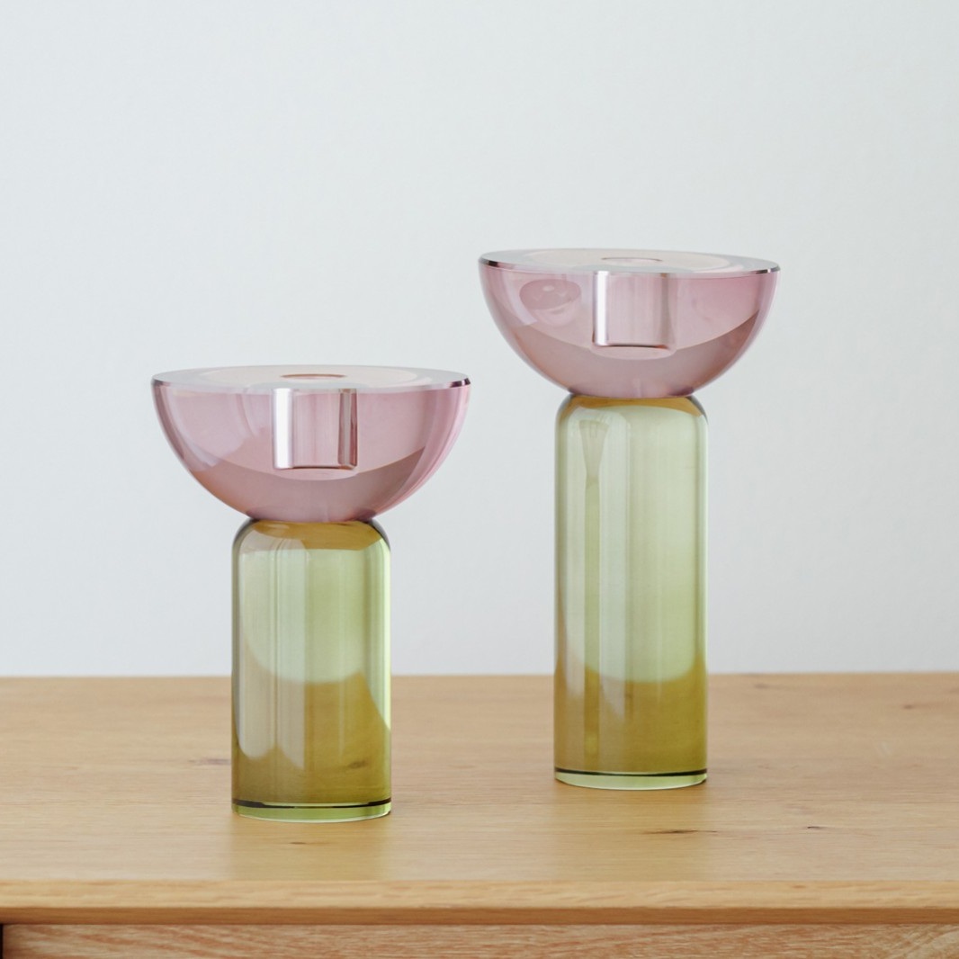 Precioso y elegante set de 2 candelabros, de diseño moderno, fabricados en cristal con base cilíndrica en color verde y parte superior semiesférica en color burdeos.