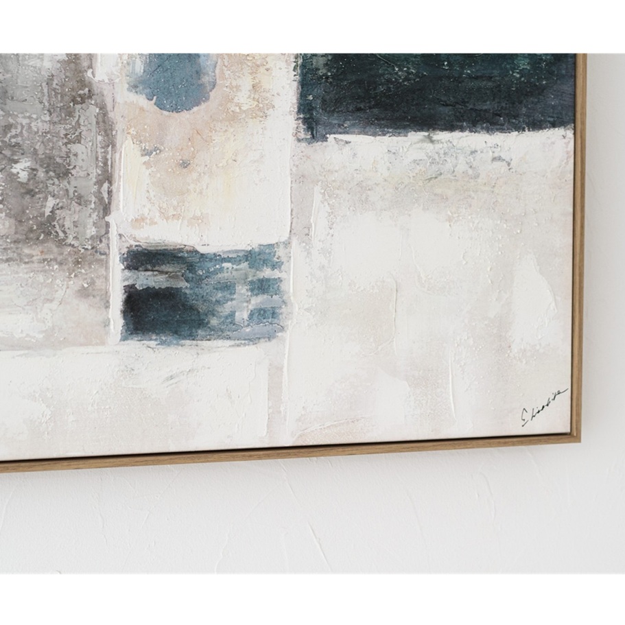 Preciosa y elegante pintura, de diseño moderno, pintada a mano sobre lienzo con suaves texturas superpuestas en tonos verdes, grises y beige. Combina con bonito marco de madera en color natural.