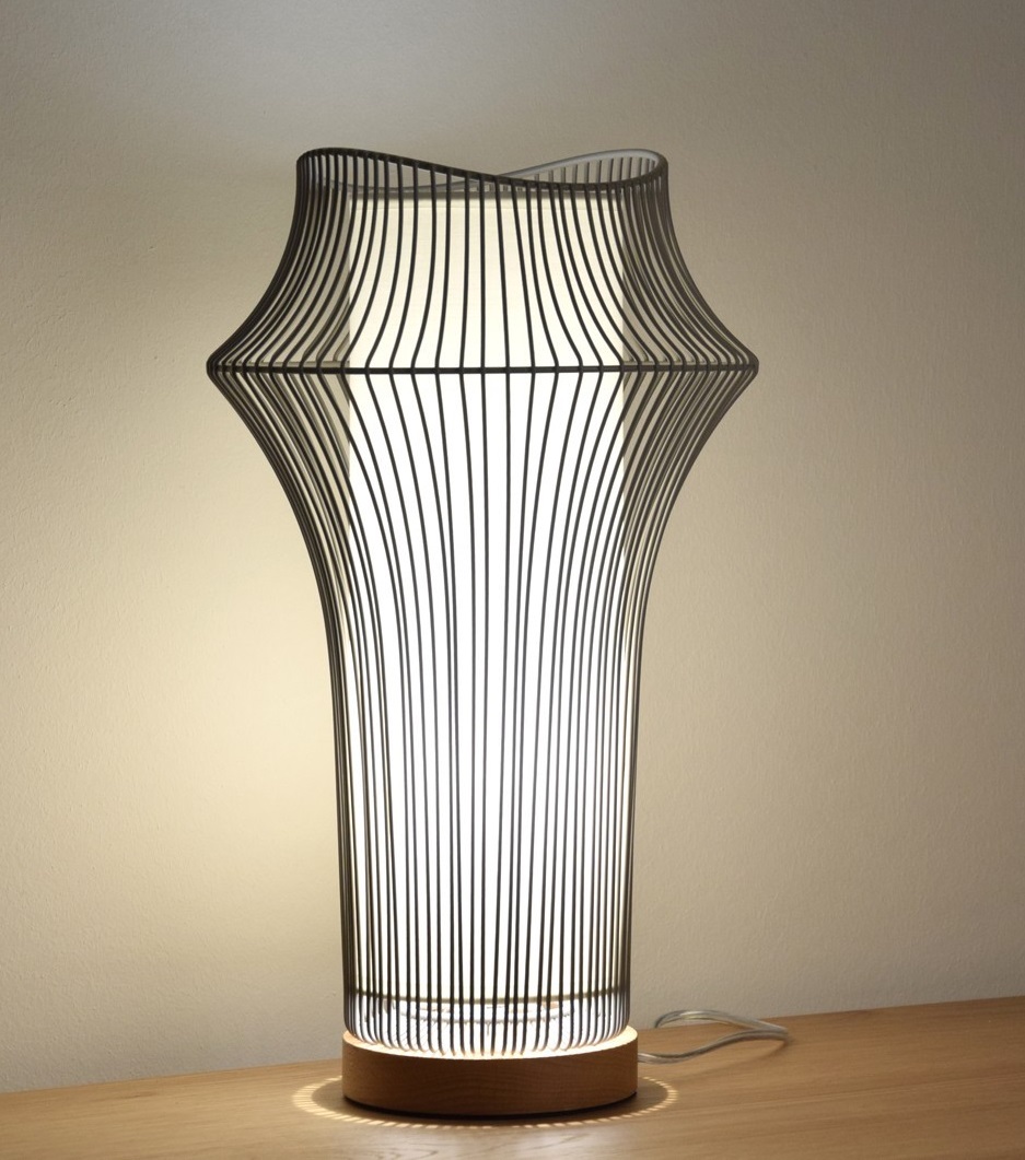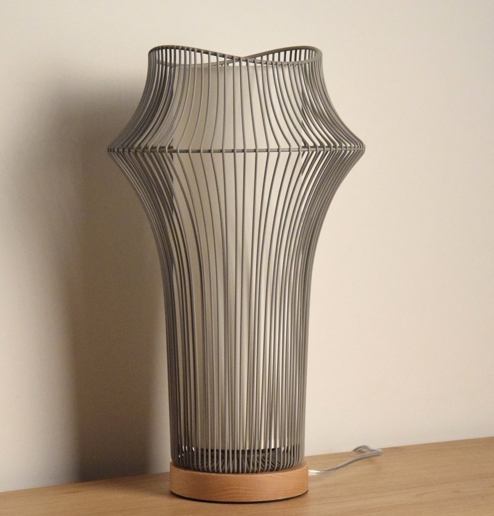 Irresistible lámpara de sobremesa de diseño moderno realizada en metal acabado gris con base de madera de haya. Su pantalla interior es de color blanco.