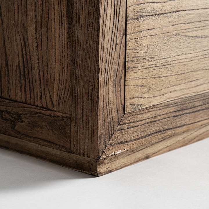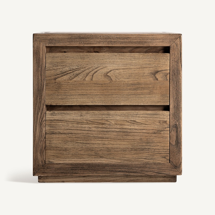 Irresistible mesita de noche, de diseño rústico, fabricada en madera de olmo con bonito acabado en color natural envejecido y 2 prácticos cajones.