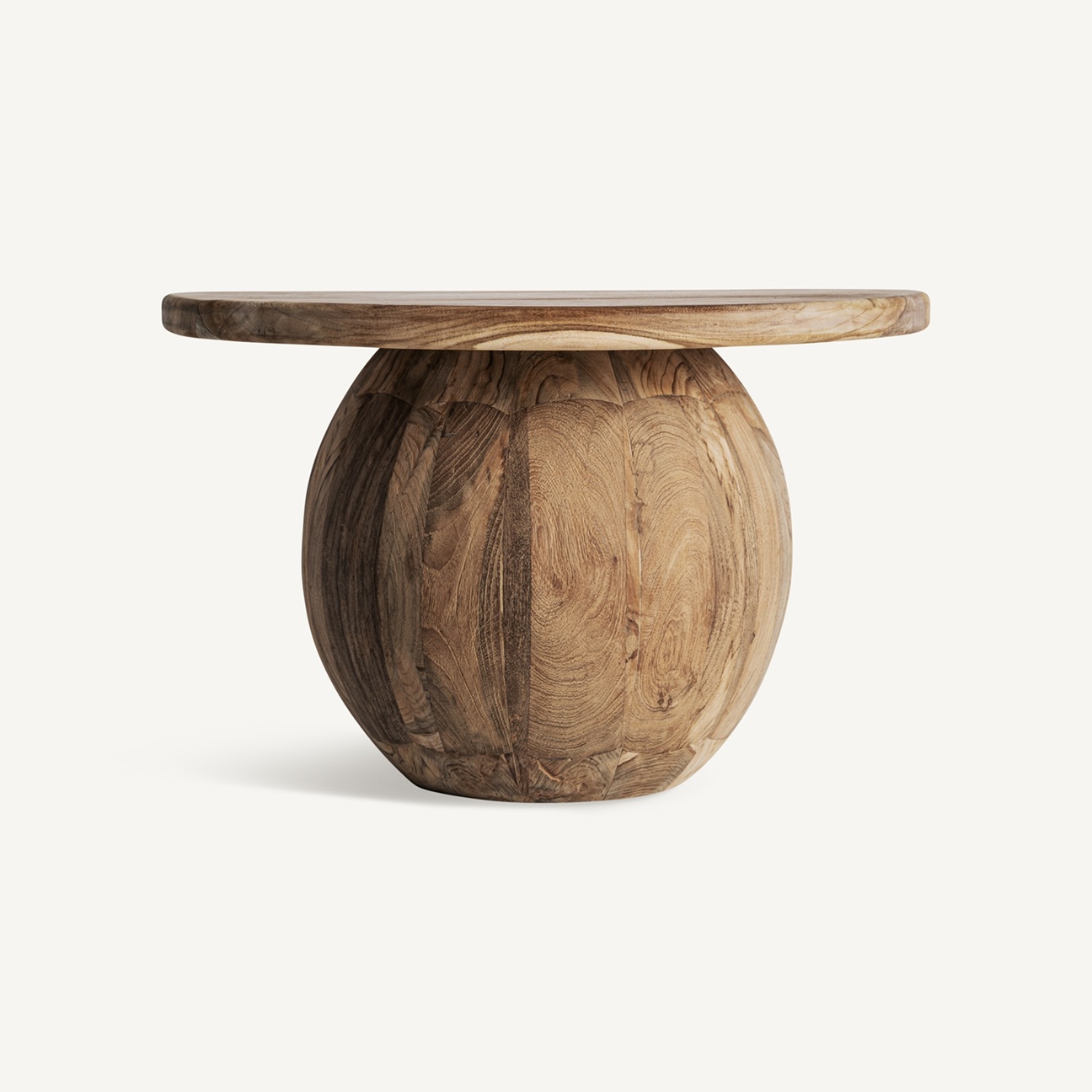 Irresistible mesa de centro redonda, de diseño rústico e inspiración étnica, fabricada en madera de teka reciclada con bonito acabado envejecido en color natural y robusta pata central.