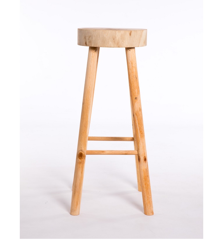 Taburete alto de estilo rústico con asiento circular y patas cilíndricas tallado en madera de paulownia y pino acabado natural.