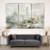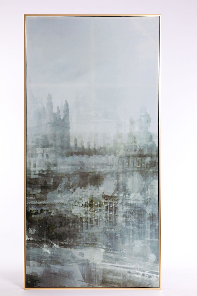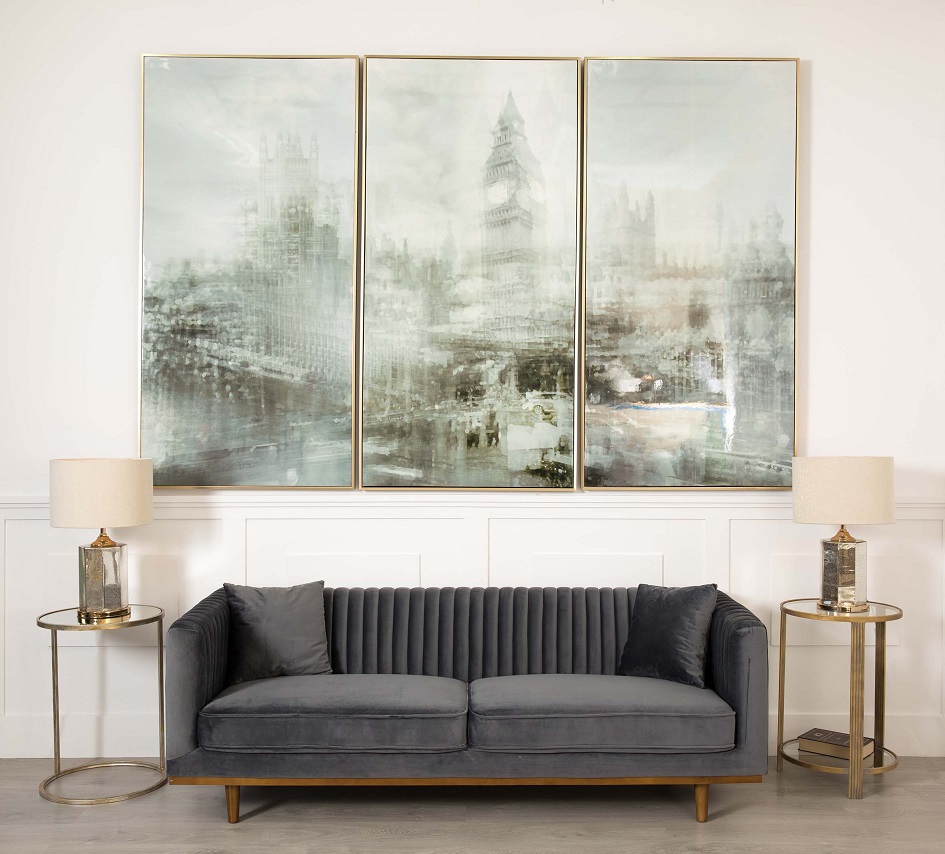 Conjunto compuesto por tres lienzos rectangulares con detalle de la ciudad de Londres acabado gris y blanco lacado, sobre bastidor fabricado en madera de abeto y marco acabado dorado y negro.