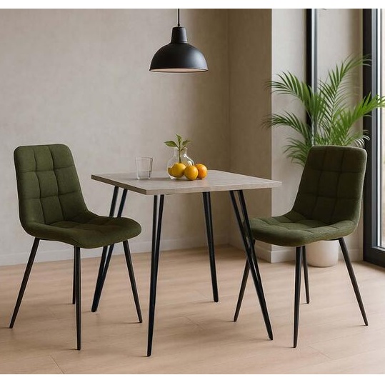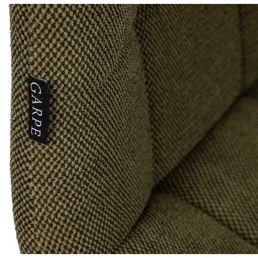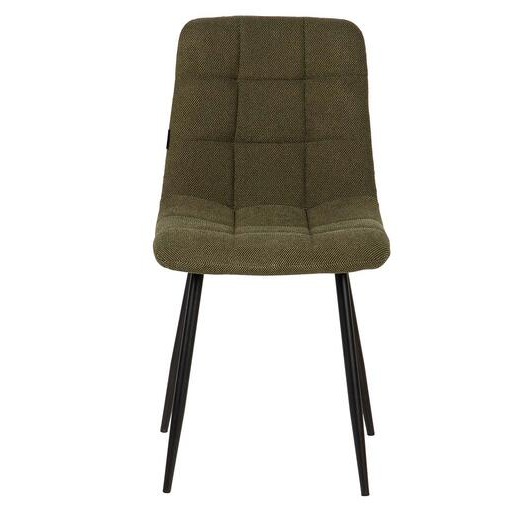 Elegante y confortable silla, de diseño moderno, tapizada en tela color verde oliva con detalle de costuras de cuadrícula. Apoya sobre patas inclinadas de metal negro.