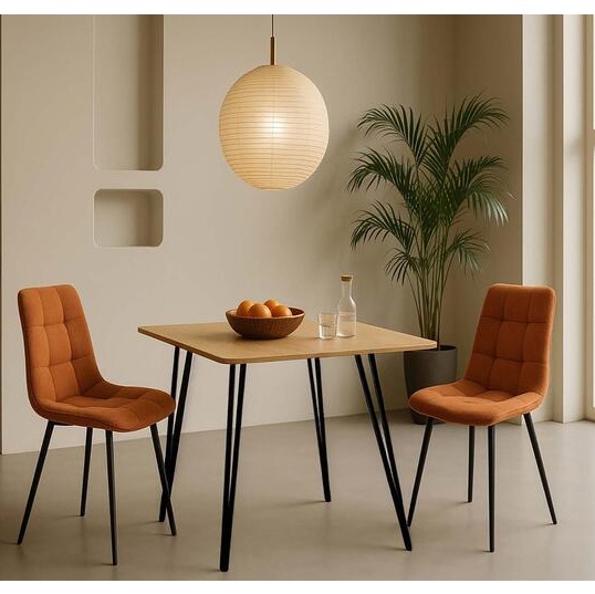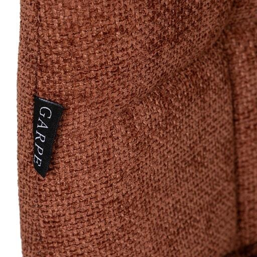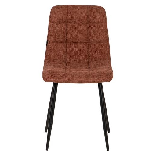 Elegante y confortable silla, de diseño moderno, tapizada en tela color terracota con detalle de costuras de cuadrícula. Apoya sobre patas inclinadas de metal negro.