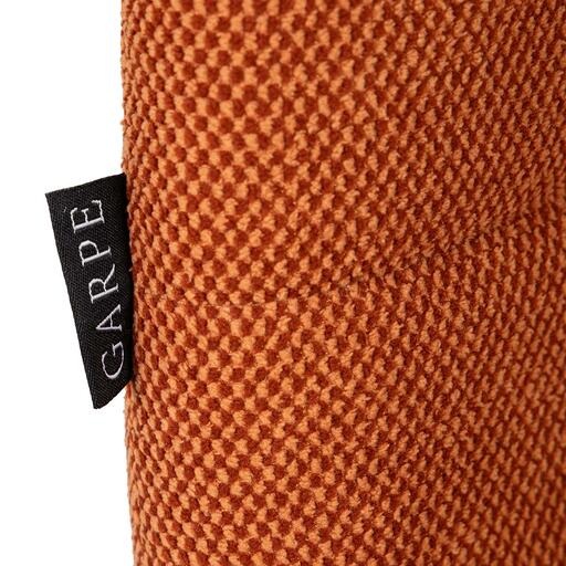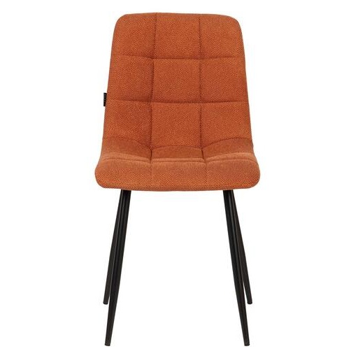 Elegante y confortable silla, de diseño moderno, tapizada en tela color naranja con detalle de costuras de cuadrícula. Apoya sobre patas inclinadas de metal negro.