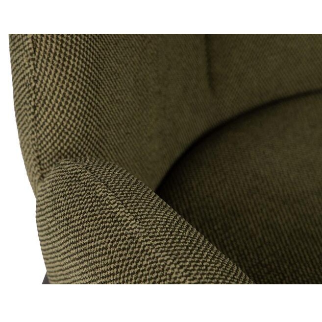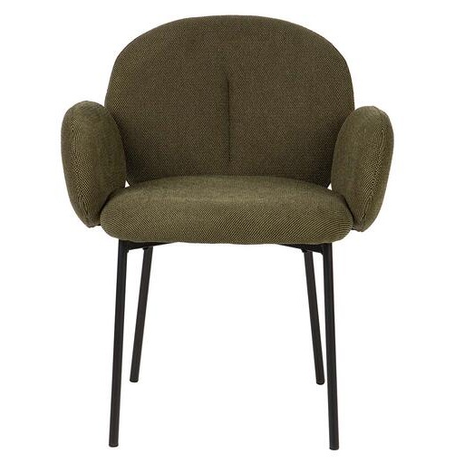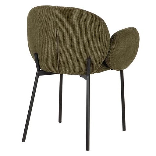 Elegante y confortable silla con reposabrazos, de diseño moderno, con originales formas redondeadas y tapizada en tela color verde. Apoya sobre patas de metal negro.