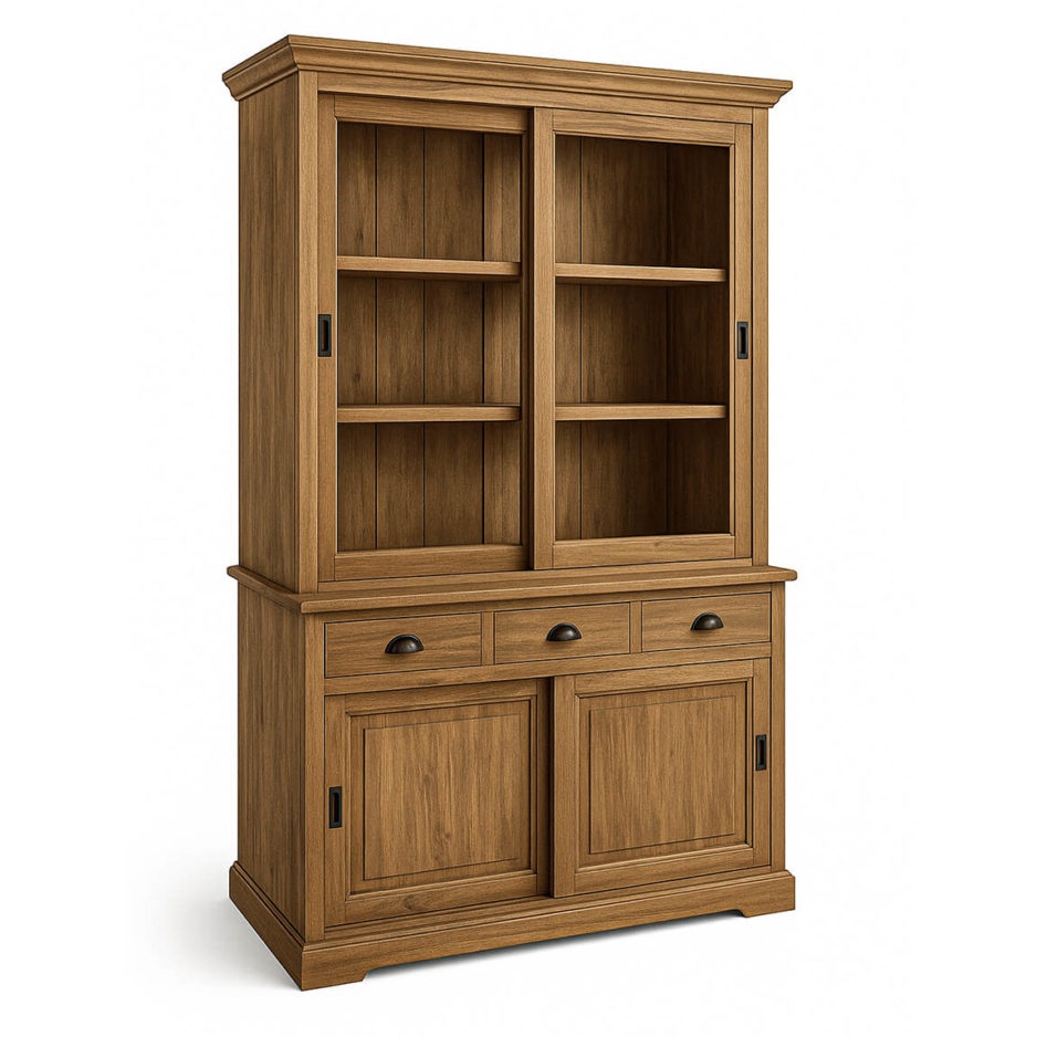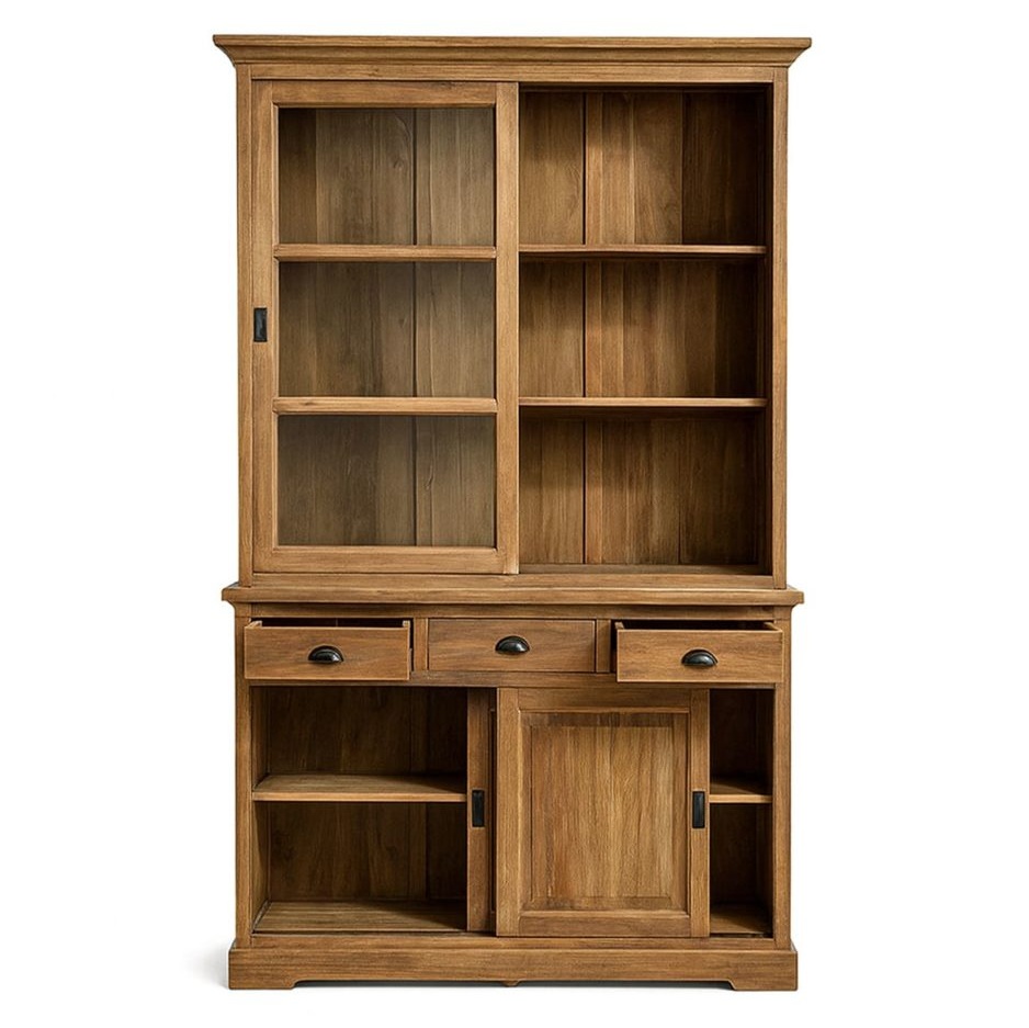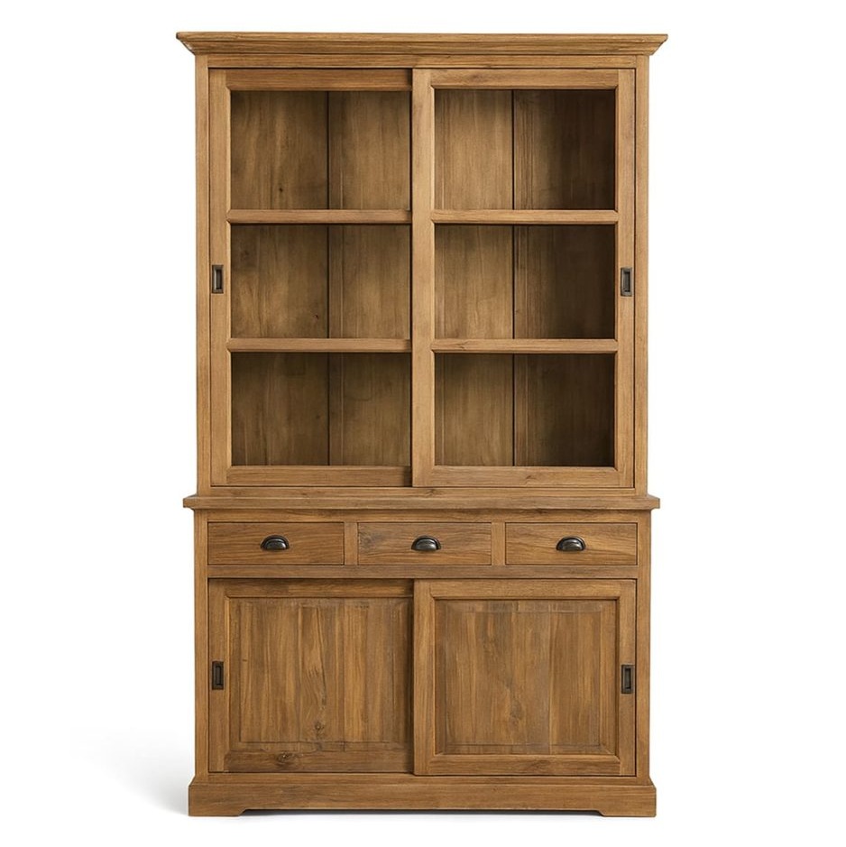 Irresistible vitrina, de gran tamaño y diseño rústico, fabricada en madera de teka con bonito acabado natural. Con puertas correderas que son acristaladas en la parte superior.