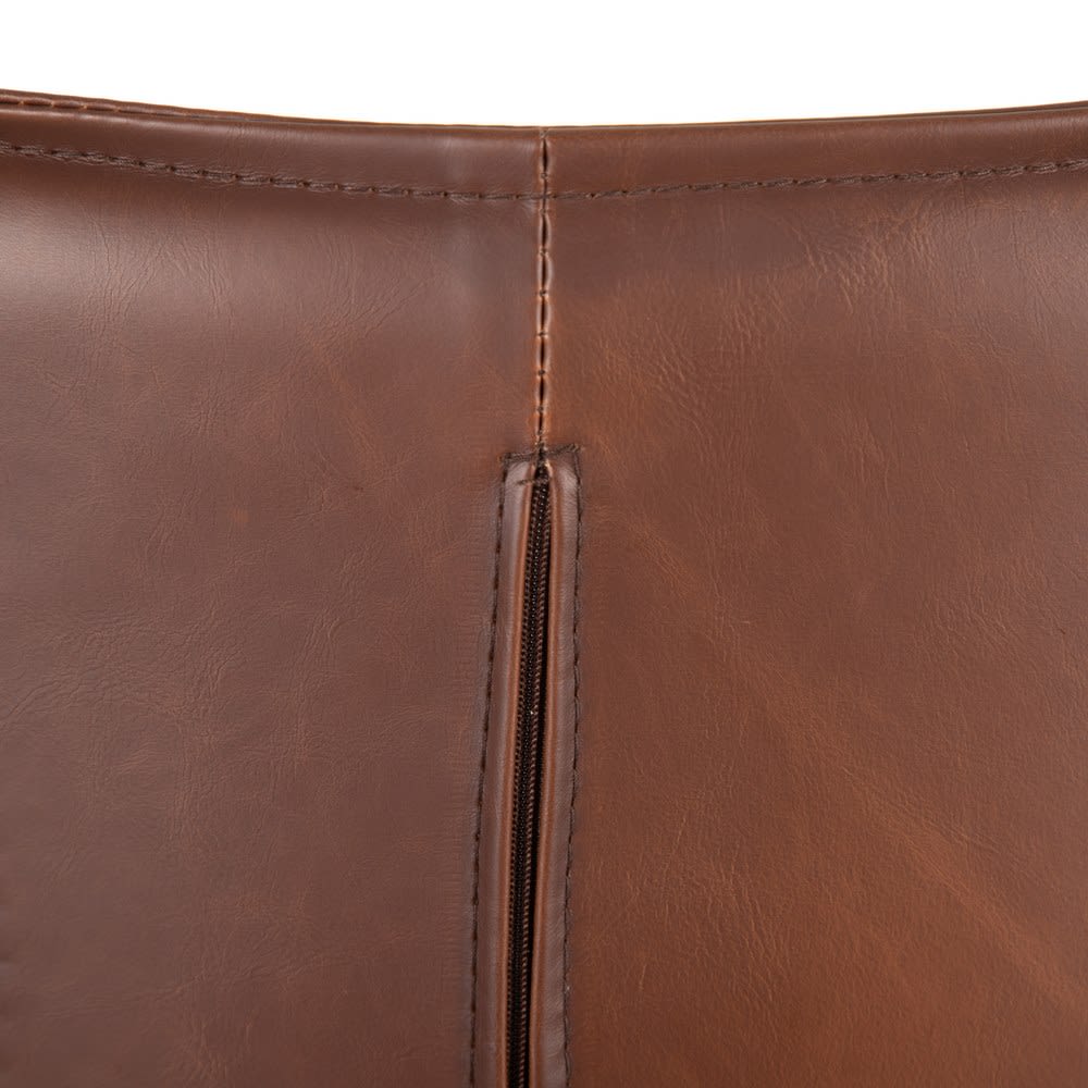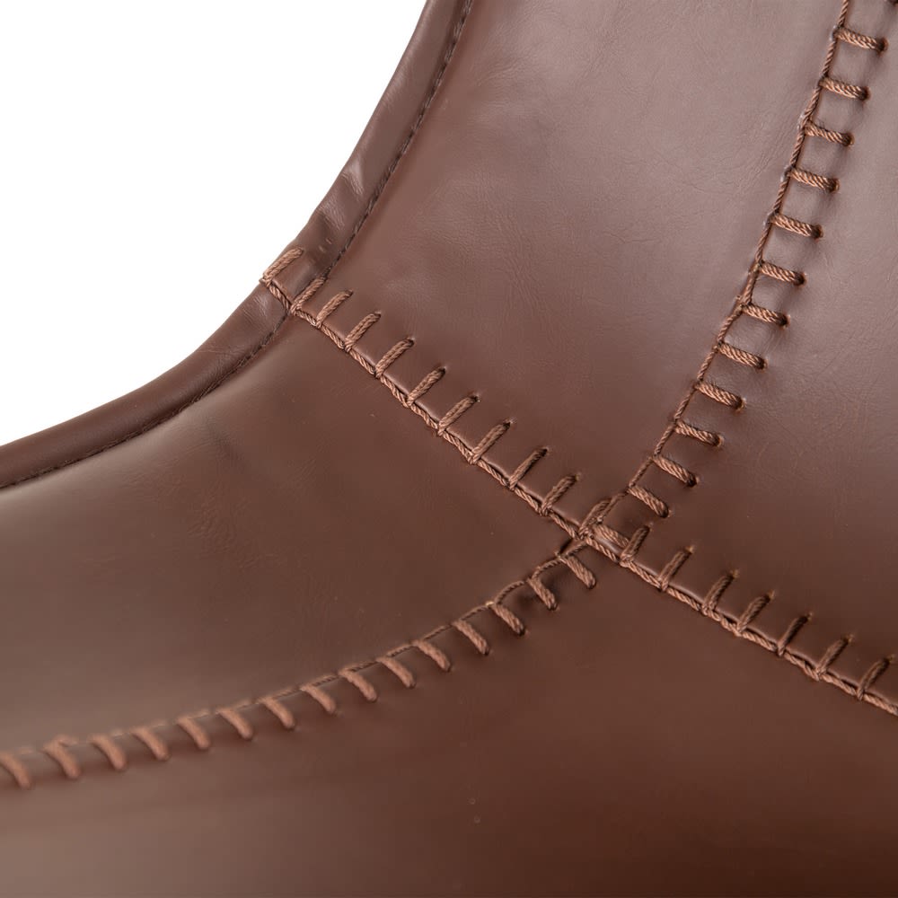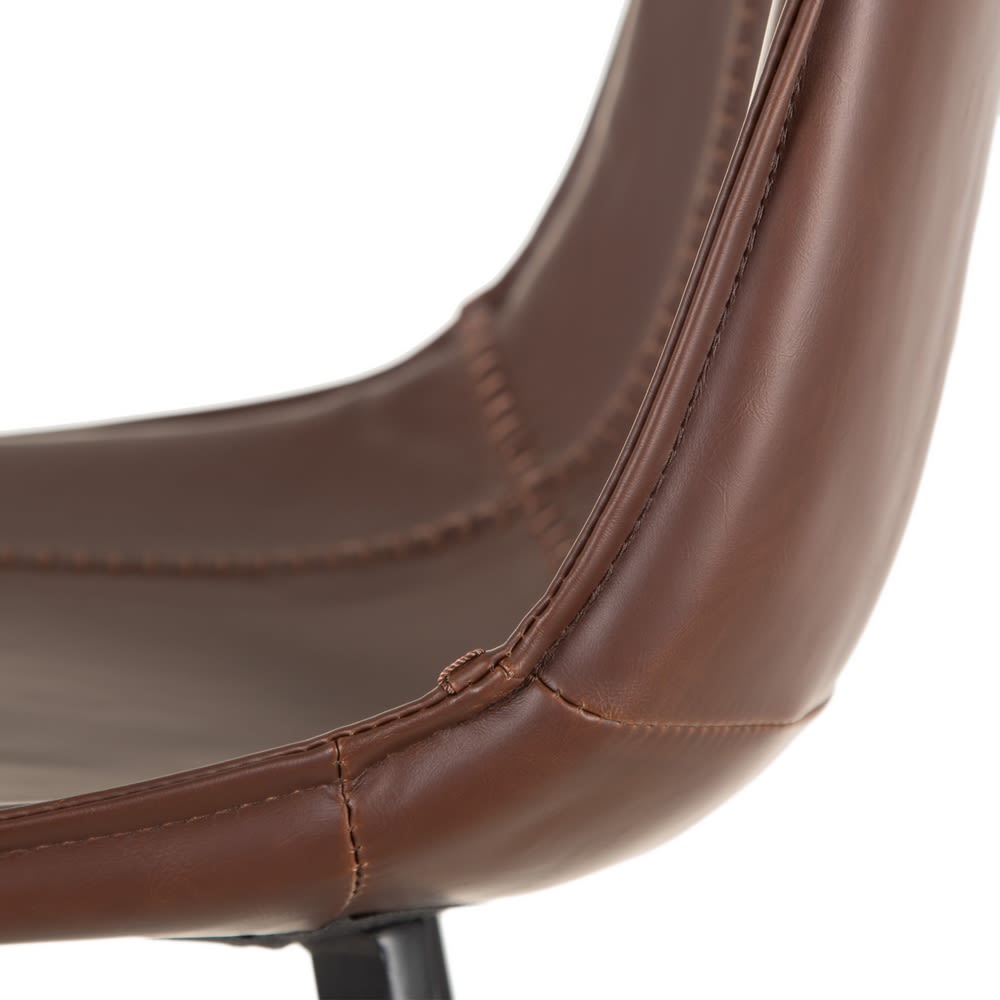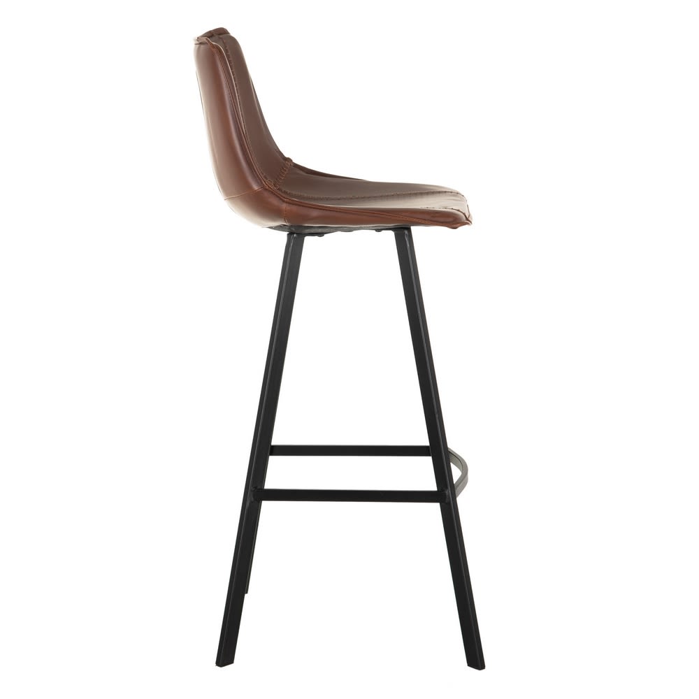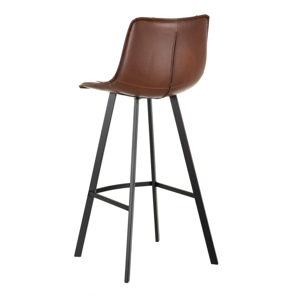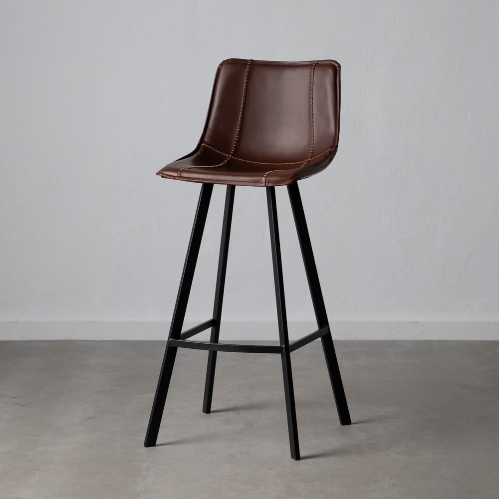 Sofisticado taburete alto de diseño vintage e inspiración industrial con patas de metal acabado negro y elegante tapizado en símil piel color camel con detalle de costuras en asiento y respaldo.