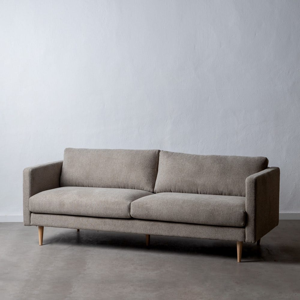 Delicioso y elegante sofá de 3 plazas de diseño moderno e inspiración nórdica tapizado en color gris, apoya sobre sencillas patas de madera de caucho.