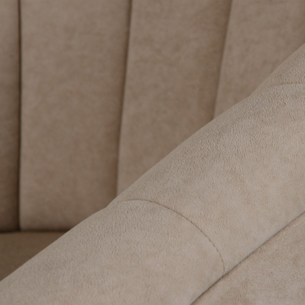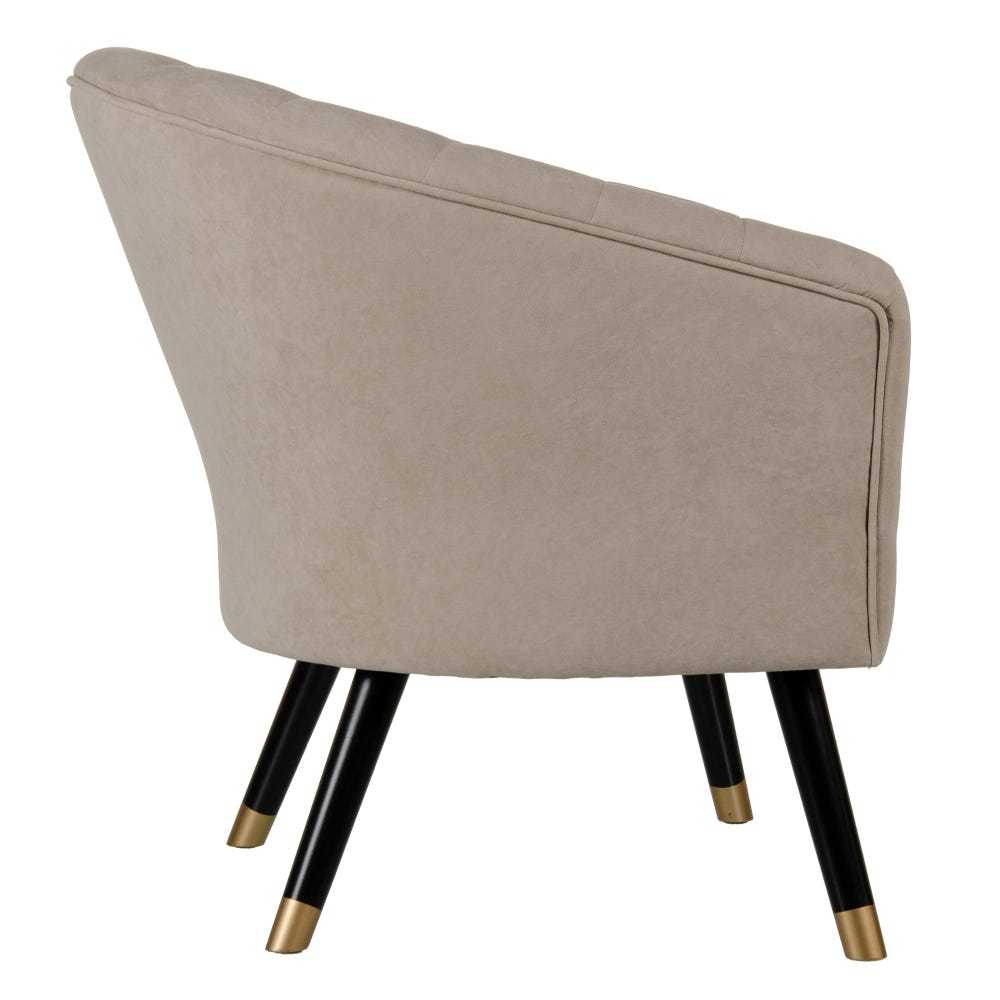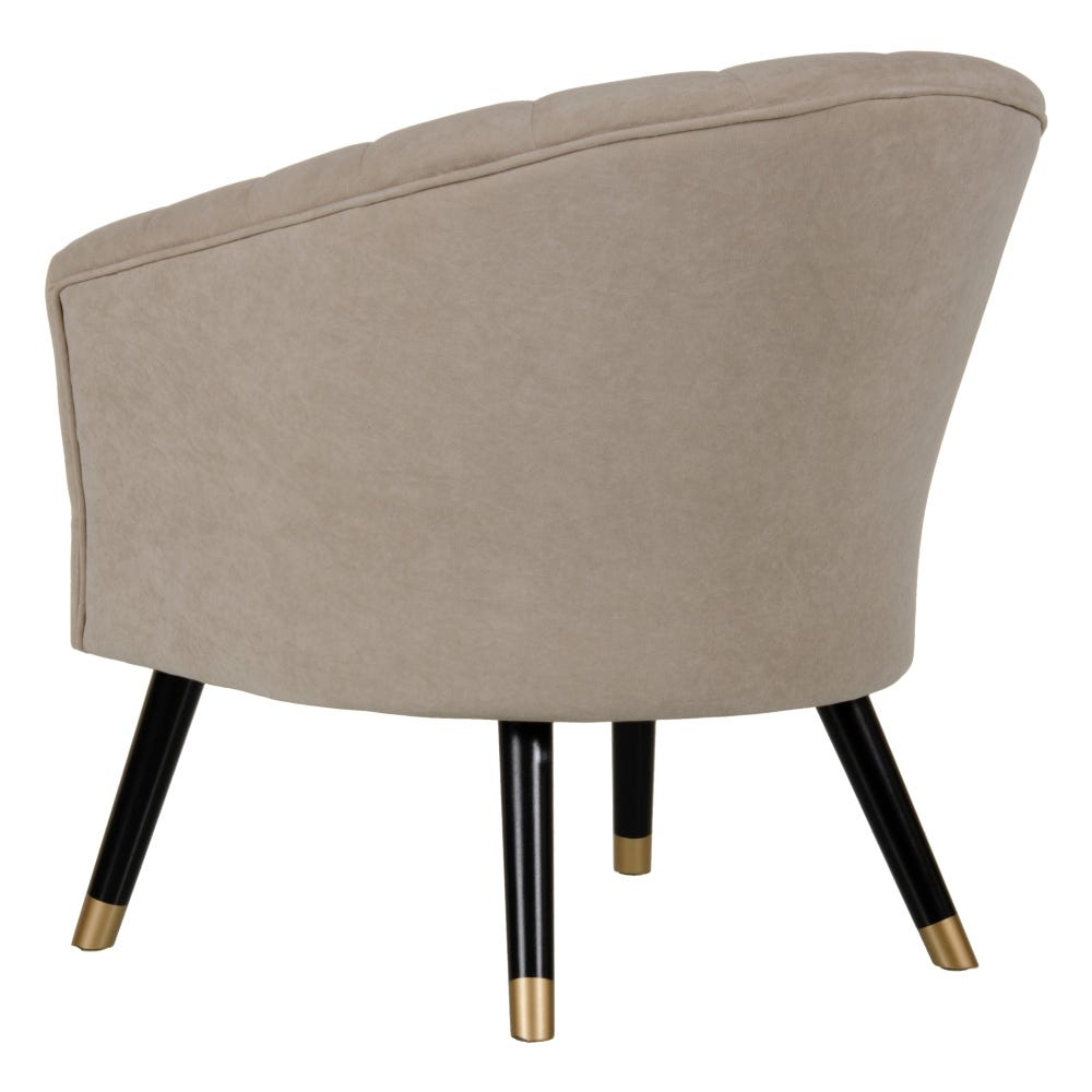 Sofisticado sillón de diseño Art Decó e inspiración vintage tapizado en precioso terciopelo color beige con detalle de costuras verticales en el respaldo. Apoya sobre elegantes patas altas de madera de abedul en colores negro y oro.