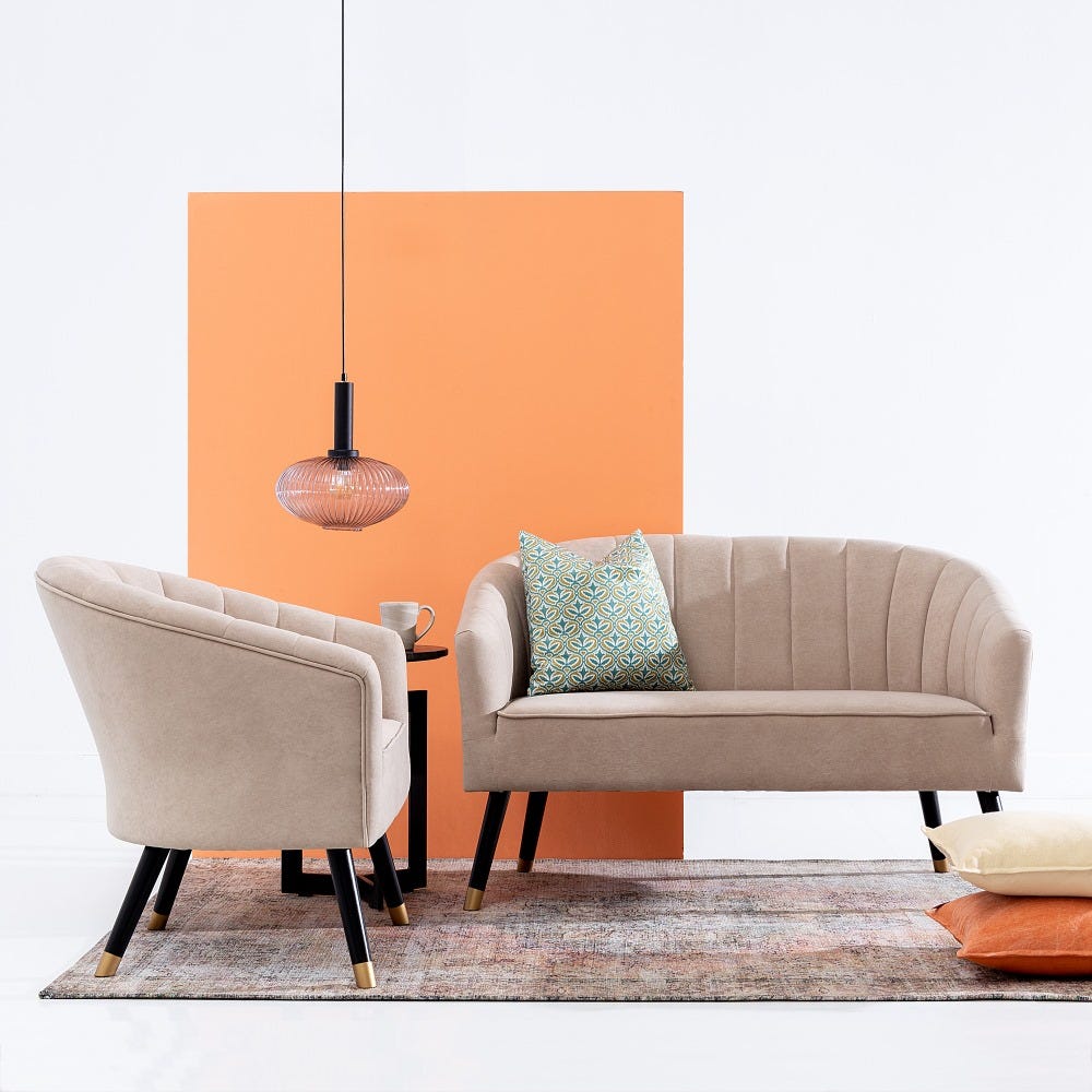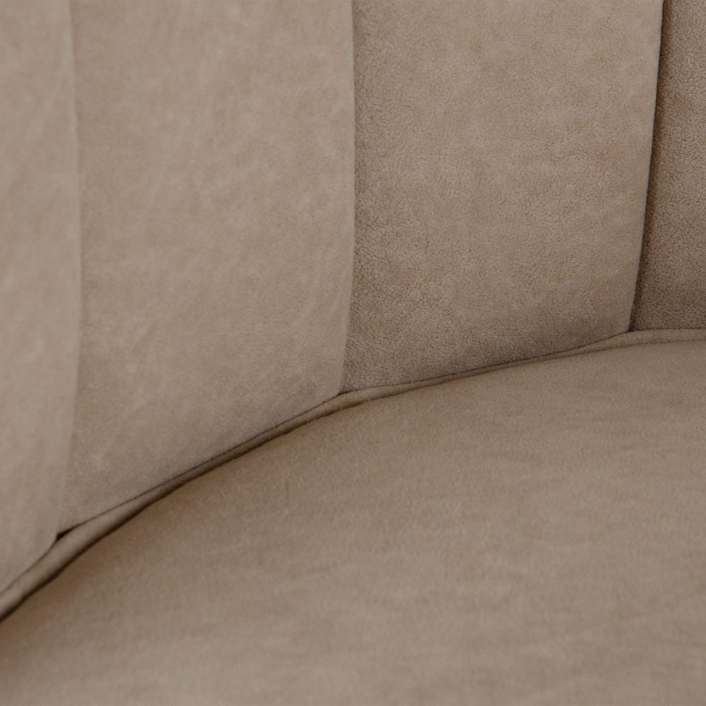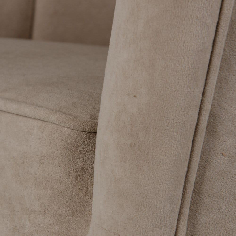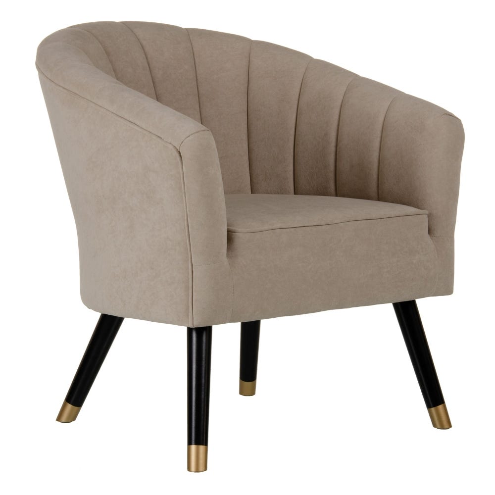 Sofisticado sillón de diseño Art Decó e inspiración vintage tapizado en precioso terciopelo color beige con detalle de costuras verticales en el respaldo. Apoya sobre elegantes patas altas de madera de abedul en colores negro y oro.